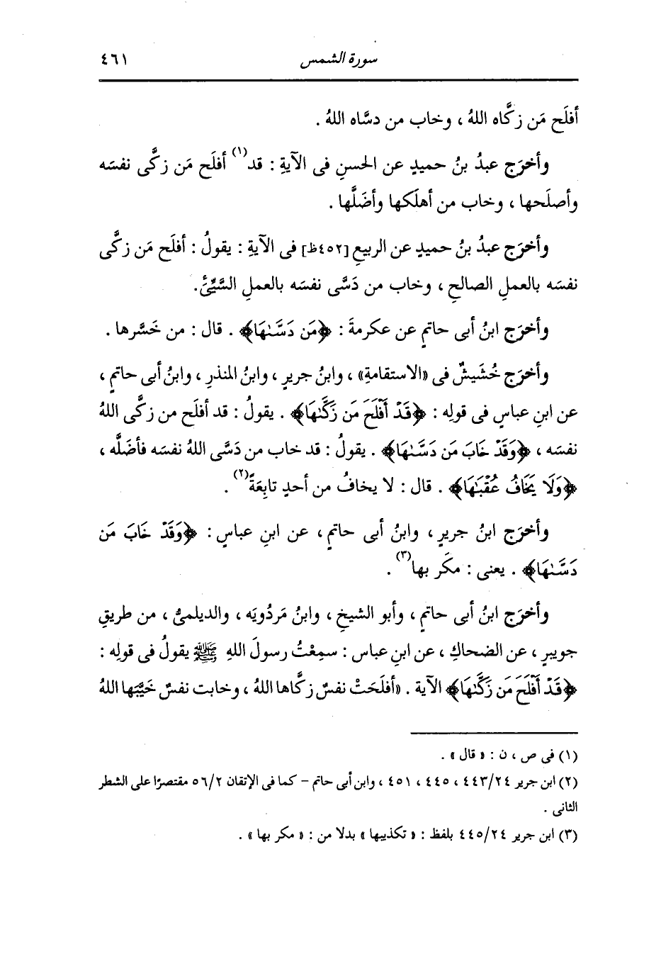 وأخرج عَبد بن حُمَيد عن الحسن في الآية : قد أفلح من زكى نفسه وأصلحها وخاب من أهلكها وأضلها.