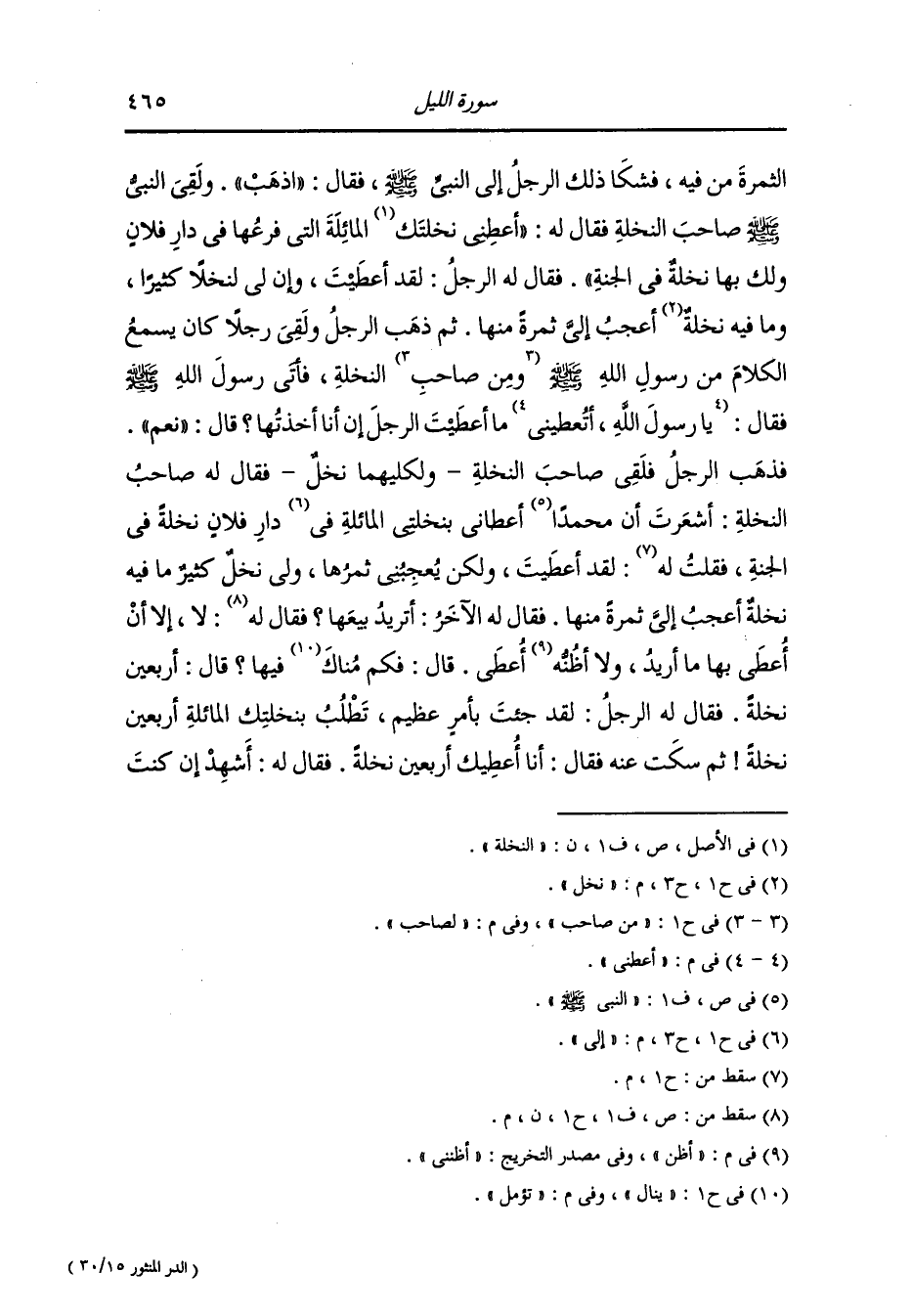الثمرة من فيه فشكا ذلك الرجل إلى النَّبِيّ صلى الله عليه وسلم فقال : اذهب ولقي النَّبِيّ صلى الله عليه وسلم صاحب النخلة ، فقال له : أعطني نخلتك المائلة التي فرعها في دار فلان ولك بها نخلة في الجنة ، فقال له الرجل : لقد أعطيت وإن لي لنخلا كثيرا وما فيه نخل أعجب إلي ثمرة منها ، ثم ذهب الرجل ولقي رجلا كان يسمع الكلام من رسول الله صلى الله عليه وسلم لصاحب النخلة فأتى رسول الله : فقال أعطني ما أعطيت الرجل إن أنا أخذتها ، قال : نعم فذهب الرجل فلقي صاحب النخلة ولكليهما نخل فقال له صاحب النخلة : أشعرت أن محمدا أعطاني بنخلتي المائلة إلى دار فلان نخلة في الجنة فقلت : لقد أعطيت ولكن يعجبني ثمرها ولي نخل كثير ما فيه نخلة أعجب إلي ثمرة منها فقال له الآخر : أتريد بيعها فقال : لا إلا أن أعطى بها ما أريد ولا أظن أعطى ، قال : فكم تؤمل فيها قال : أربعين نخلة فقال له الرجل : لقد جئت بأمر عظيم تطلب بنخلتك المائلة أربعين نخلة ، ثم سكت عنه فقال : أنا أعطيك أربعين نخلة فقال له : أشهد إن كنت