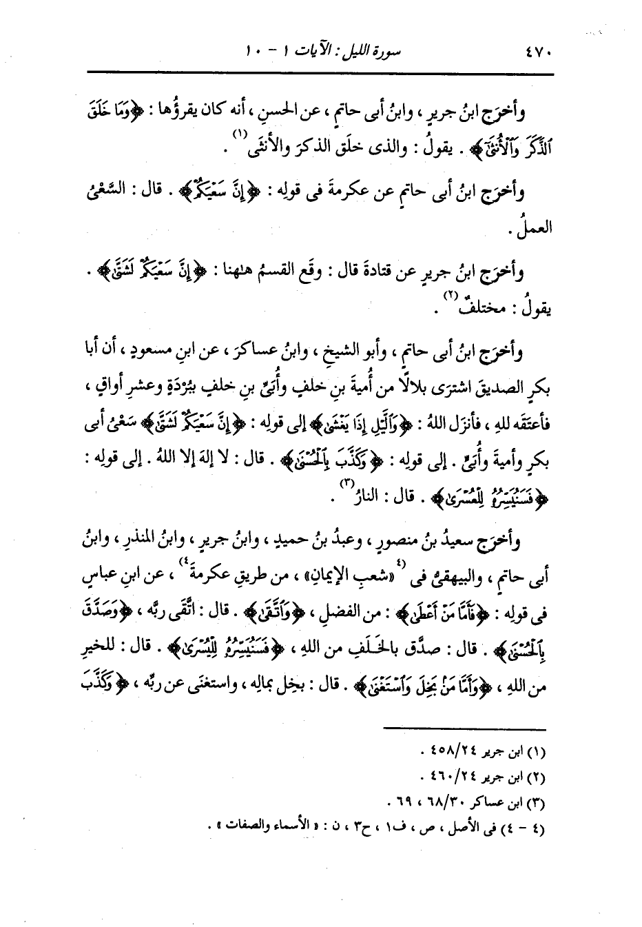 الصديق اشترى بلالا من أمية بن خلف وأبي بن خلف ببردة وعشر أواق فأعتقه لله فأنزل الله {والليل إذا يغشى} {إن سعيكم لشتى} سعي أبي بكر وأمية وأبي إلى قوله : {وكذب بالحسنى} قال : لا إله إلا الله إلى قوله : {فسنيسره للعسرى} قال : النار.
