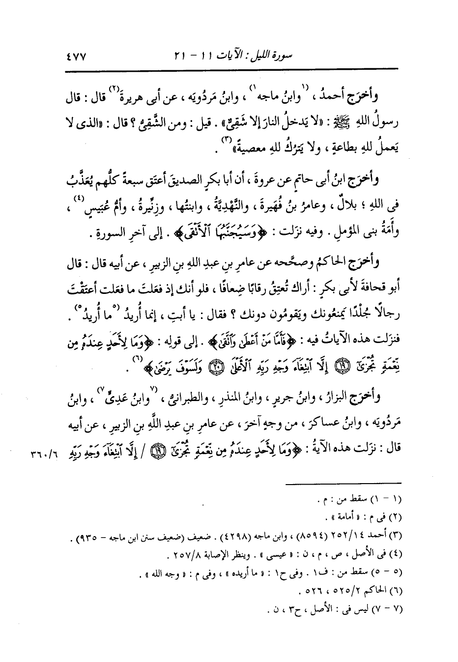 وأخرج ابن أبي حاتم عن عروة أن أبا بكر الصديق أعتق سبعة كلهم يعذب في الله بلال وعامر بن فهيرة والنهدية وابنتها وزنيرة وأم عيسى وأمة بني المؤمل وفيه نزلت {وسيجنبها الأتقى} إلى آخر السورة.