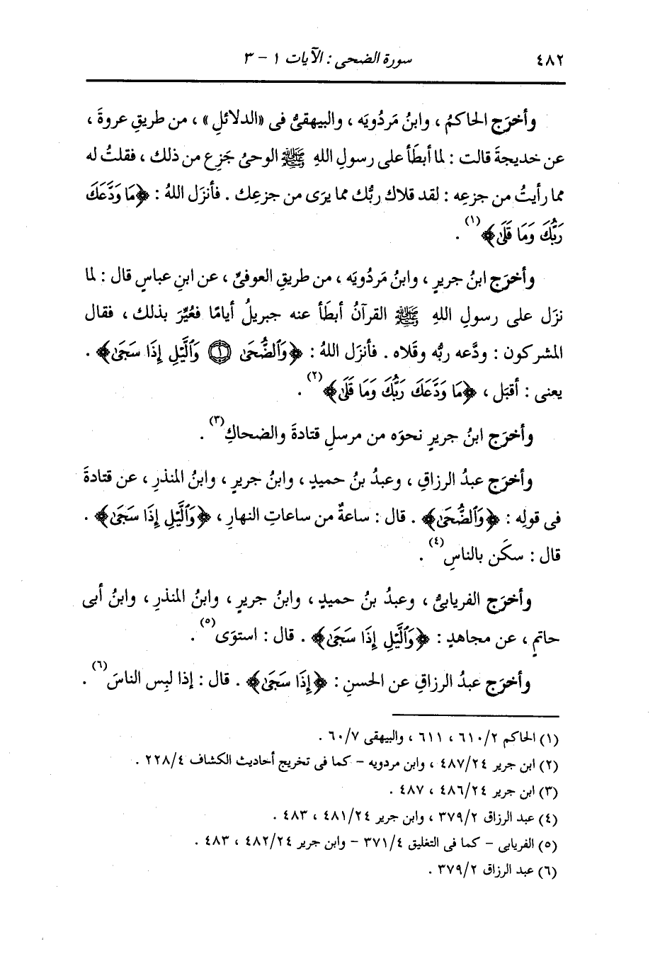 وأخرج ابن جرير ، وَابن مردويه من طريق العوفي عن ابن عباس رضي الله عنهما قال : لما نزل على رسول الله صلى الله عليه وسلم القرآن أبطأ عنه جبريل أياما فعير بذلك فقال المشركون : ودعه ربه وقلاه فأنزل الله {والضحى والليل إذا سجى} يعني أقبل {ما ودعك ربك وما قلى}.