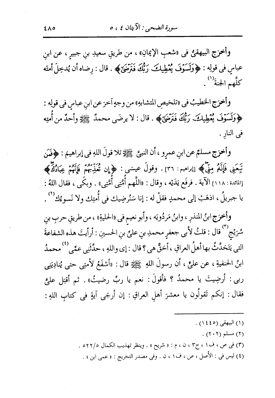 وأخرج الخطيب في تلخيص المتشابه من وجه آخر عن ابن عباس رضي الله عنهما في قوله : {ولسوف يعطيك ربك فترضى} قال : لا يرضى محمد واحد من أمته في النار.