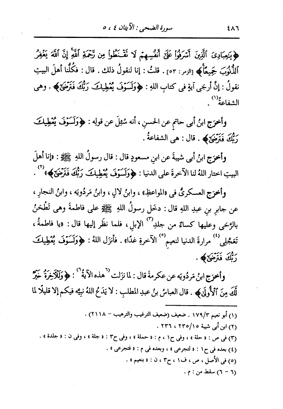 (يا عبادي الذين أسرفوا على أنفسهم لا تقنطوا من رحمة الله إن الله يغفر الذنوب جميعا) (سورة الزمر الآية 53) قلت : إنا لنقول ذلك ، قال فكلنا أهل البيت نقول : إن أرجي آية في كتاب الله {ولسوف يعطيك ربك فترضى} وهي الشفاعة.