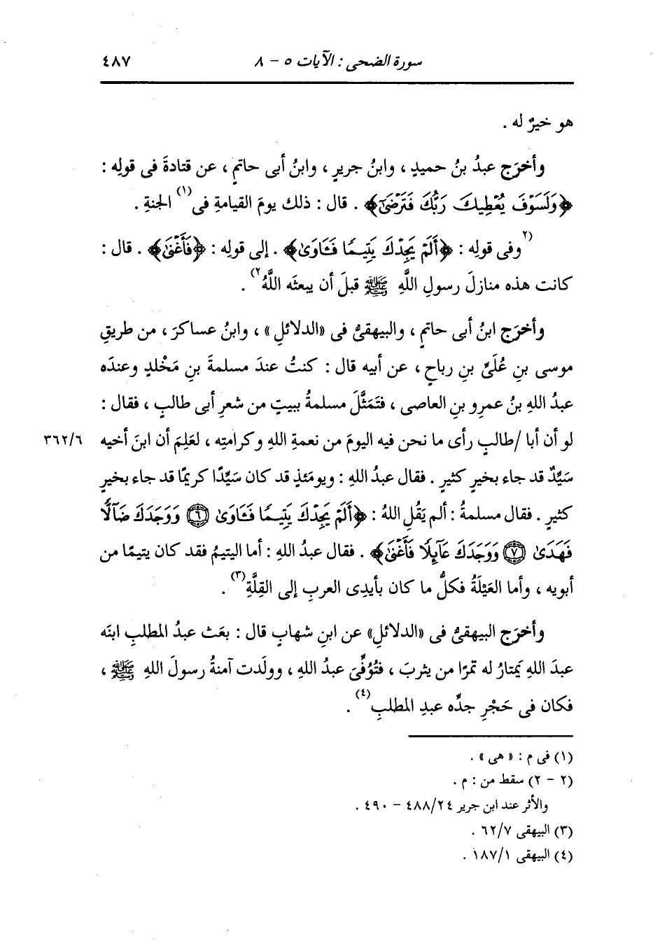 وأخرج ابن أبي حاتم والبيهقي في الدلائل ، وَابن عساكر من طريق موسى بن علي بن رباح عن أبيه رضي الله عنه قال : كنت عند مسلمة بن مخلد وعنده عبد الله بن عمرو بن العاص فتمثل مسلمة ببيت من شعر أبي طالب فقال : لو أن أبا طالب رأى ما نحن فيه اليوم من نعمة الله وكرامته لعلم أن ابن أخيه سيد قد جاء بخير كثير فقال عبد الله : ويومئذ قد كان سيدا كريما قد جاء بخير كثير فقال مسلمة : ألم يقل الله {ألم يجدك يتيما فآوى ووجدك ضالا فهدى ووجدك عائلا فأغنى} فقال عبد الله : أما اليتيم فقد كان يتيما من أبويه وأما العيلة فكل ما كان بأيدي العرب إلى القلة.