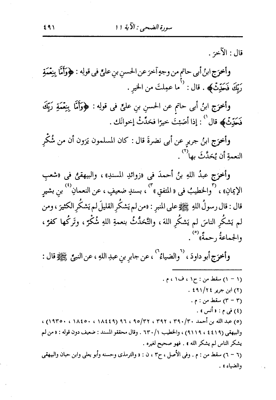وأخرج ابن جرير عن أبي نضرة قال : كان المسلمون يرون أن من شكر النعمة أن يحدث بها.