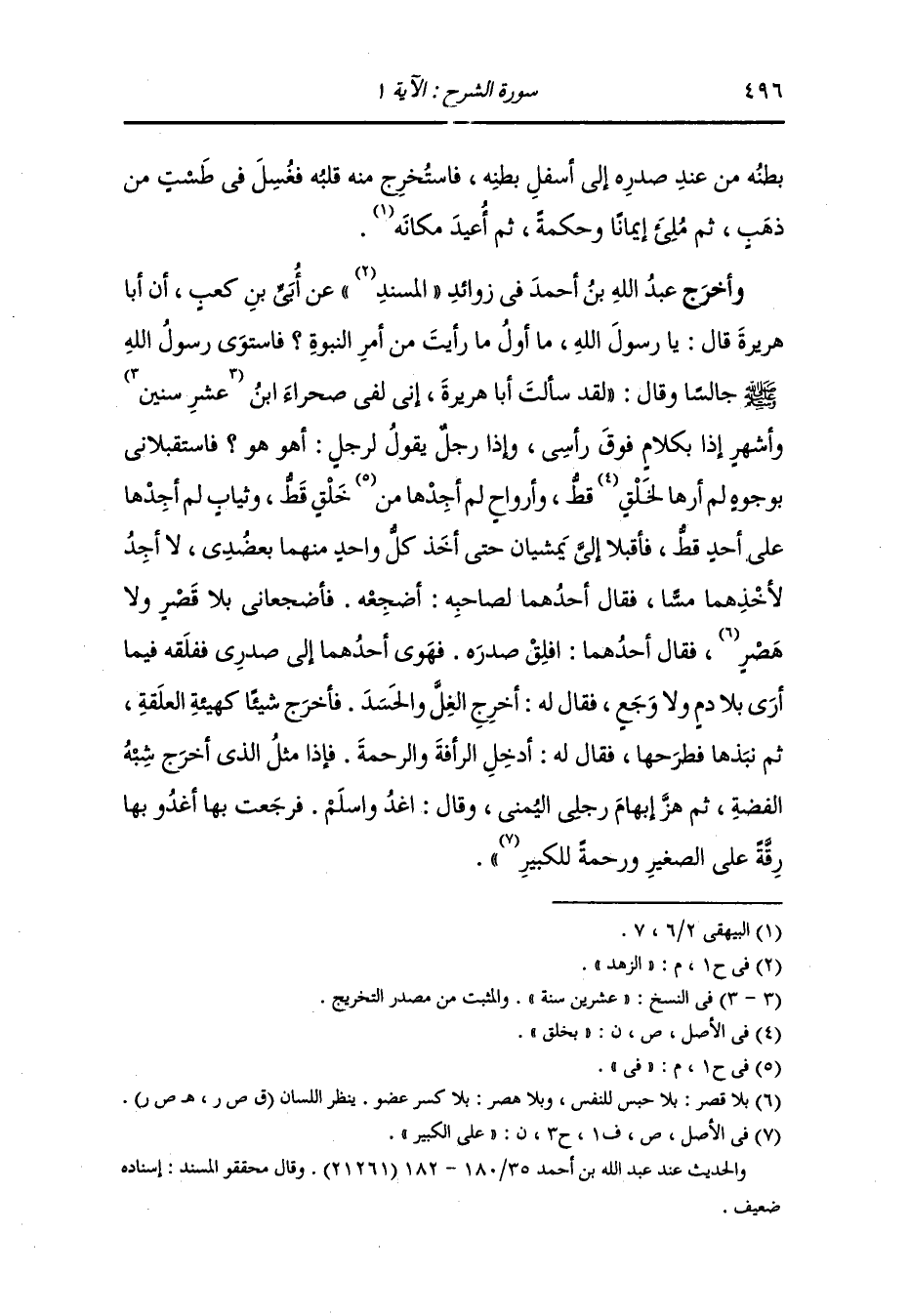 صدره إلى أسفل بطنه فاستخرج من قلبه فغسل في طست من ذهب ثم ملئ إيمانا وحكمة ثم أعيد مكانه.