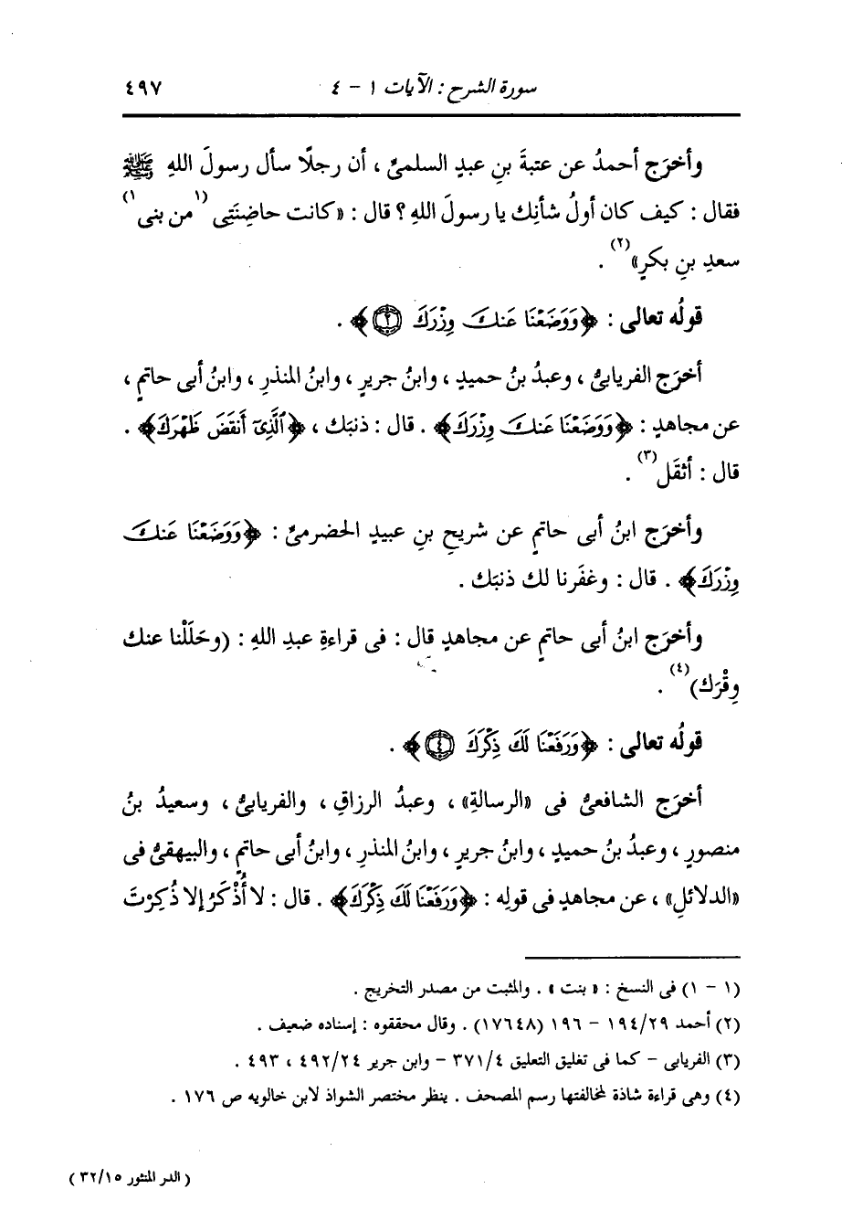 أخرج الفريابي ، وعَبد بن حُمَيد ، وَابن جَرِير ، وَابن المنذر ، وَابن أبي حاتم عن مجاهد {ووضعنا عنك وزرك} قال : ذنبك {الذي أنقض ظهرك} قال : أثقل.