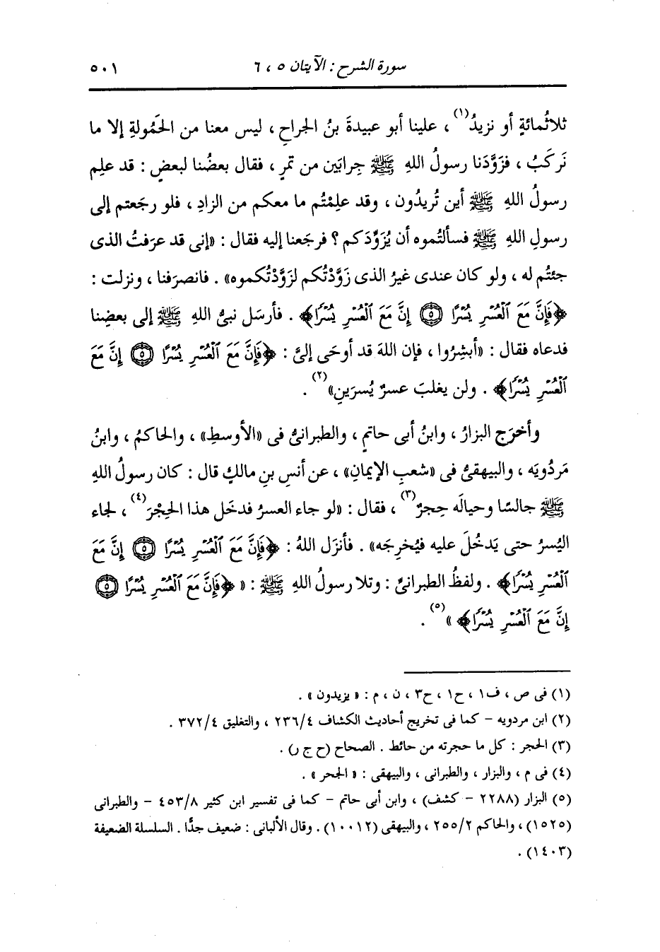 ثلثمائة أو يزيدون علينا أبو عبيدة بن الجراح ليس معنا من الحمولة إلا ما نركب فزودنا رسول الله صلى الله عليه وسلم جرابين من تمر فقال بعضنا لبعض : قد علم رسول الله صلى الله عليه وسلم أين تريدون وقد علمتم ما معكم من الزاد فلو رجعتم إلى رسول الله صلى الله عليه وسلم فسألتموه أن يزودكم فرجعنا إليه فقال : إني قد عرفت الذي جئتم له ولو كان عندي غير الذي زودتكم لزودتكموه ، فانصرفنا ونزلت {فإن مع العسر يسرا إن مع العسر يسرا} فأرسل نبي الله إلى بعضنا فدعاه فقال : أبشروا فإن الله قد أوحى إلي {فإن مع العسر يسرا إن مع العسر يسرا} وإن يغلب عسر يسيرين.