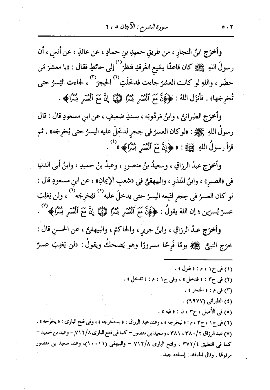 وأخرج عبد الرزاق وسعيد بن منصور ، وعَبد بن حُمَيد ، وَابن أبي الدنيا في الصبر ، وَابن المنذر والبيهقي في شعب الإيمان عن ابن مسعود قال : لو كان العسر في حجر لتبعه اليسر حتى يدخل عليه ليخرجه ولن يغلب عسر يسرين إن الله يقول : {فإن مع العسر يسرا إن مع العسر يسرا}.