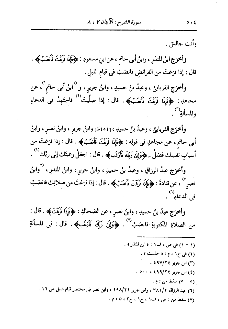 وأخرج الفريابي ، وعَبد بن حُمَيد ، وَابن جَرِير ، وَابن أبي حاتم عن مجاهد {فإذا فرغت فانصب} قال : إذا جلست فاجتهد في الدعاء والمسألة.