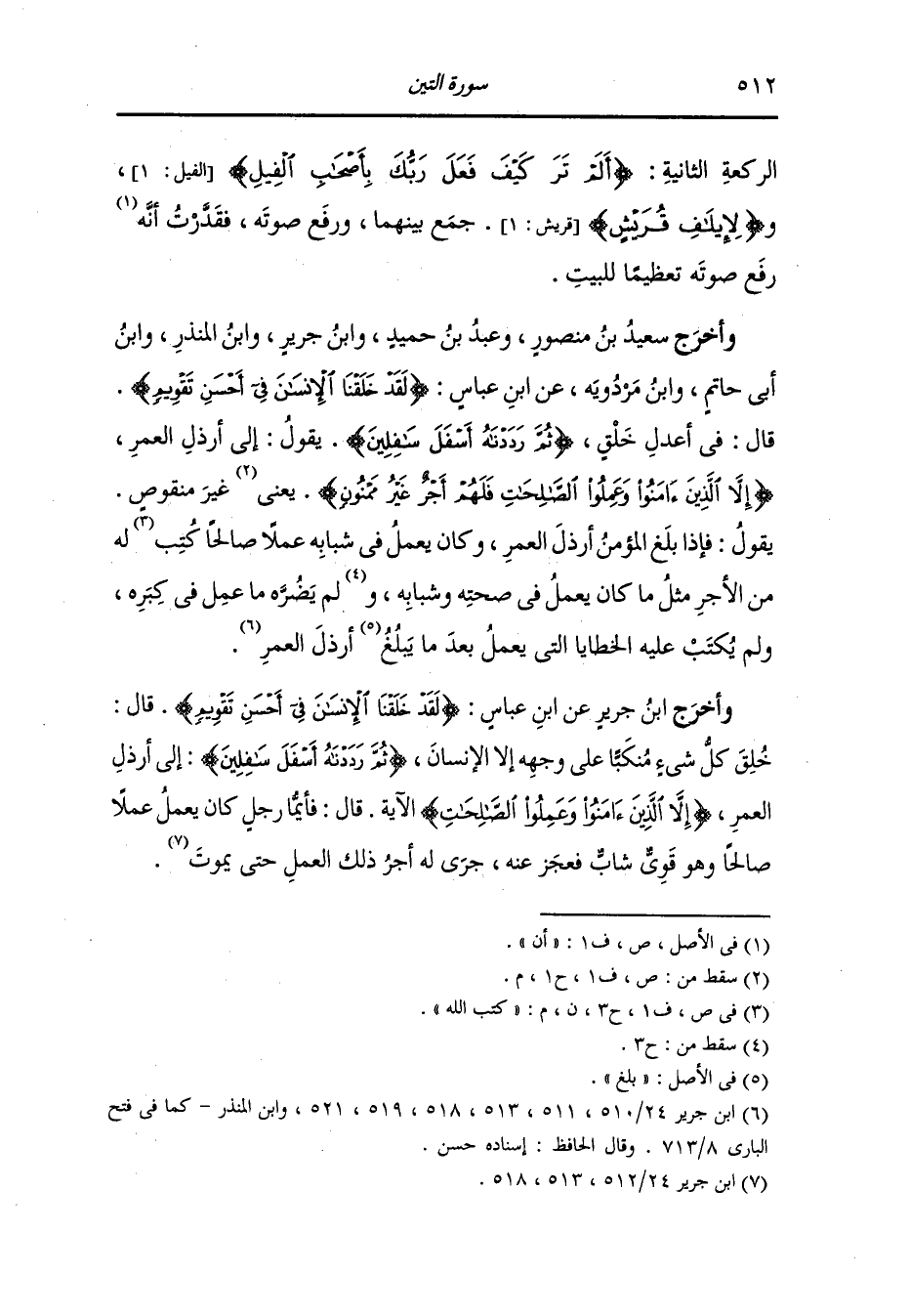 وأخرج سعيد بن منصور ، وَابن جَرِير ، وعَبد بن حُمَيد ، وَابن المنذر ، وَابن أبي حاتم ، وَابن مردويه عن ابن عباس {لقد خلقنا الإنسان في أحسن تقويم} قال : في أعدل خلق {ثم رددناه أسفل سافلين} يقول : إلى أرذل العمر {إلا الذين آمنوا وعملوا الصالحات فلهم أجر غير ممنون} غير منقوص ، يقول : فإذا بلغ المؤمن أرذل العمر وكان يعمل في شبابه عملا صالحا كتب الله له من الأجر مثله ما كان يعمل في صحته وشبابه ولم يضره ما عمل في كبره ولم يكتب عليه الخطايا التي يعمل بعد ما يبلغ أرذل العمر.