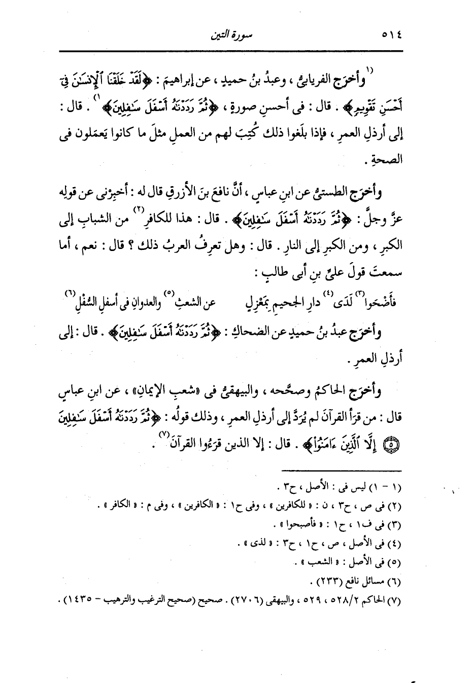 وأخرج الحاكم وصححه والبيهقي في شعب الإيمان عن ابن عباس قال : من قرأ القرآن لم يرد إلى أرذل العمر وذلك قوله : {ثم رددناه أسفل سافلين إلا الذين آمنوا وعملوا الصالحات} قال : إلا الذين قرؤوا القرآن.