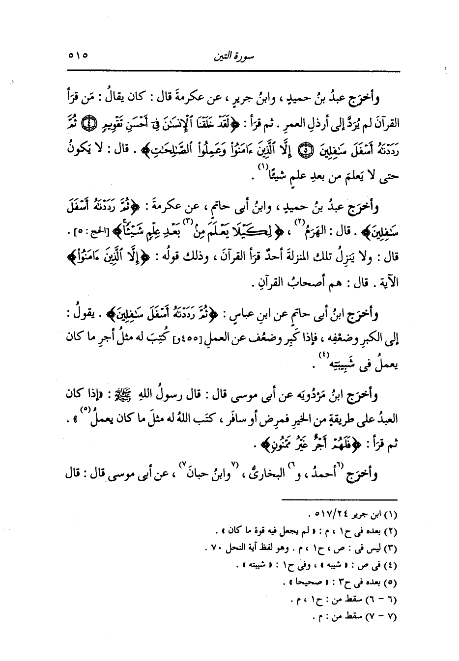 وأخرج عَبد بن حُمَيد ، وَابن أبي حاتم عن عكرمة {ثم رددناه أسفل سافلين} قال : الهرم لم يجعل فيه قوة ما كان (لكي لا يعلم بعد علم شيئا) (سورة الحج الآية 5) قال : ولا ينزل تلك المنزلة أحد قرأ القرآن وذلك قوله : {إلا الذين آمنوا} الآية ، قال : هم أصحاب القرآن.