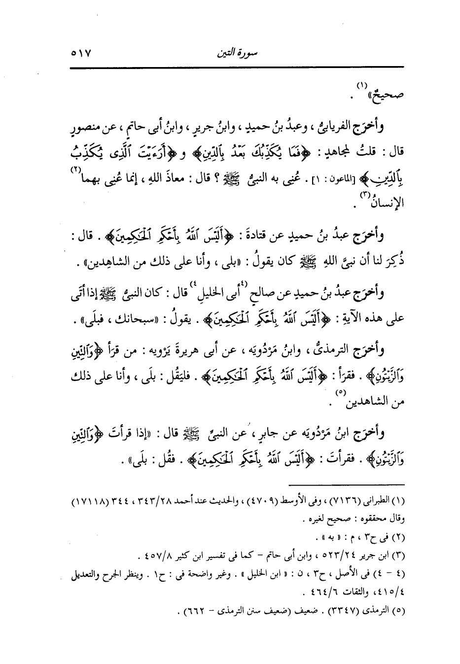 وأخرج الترمذي وان مردويه عن أبي هريرة يرويه : من قرأ {والتين والزيتون} فقرأ {أليس الله بأحكم الحاكمين} فليقل بلى وأنا على ذلك من الشاهدين.