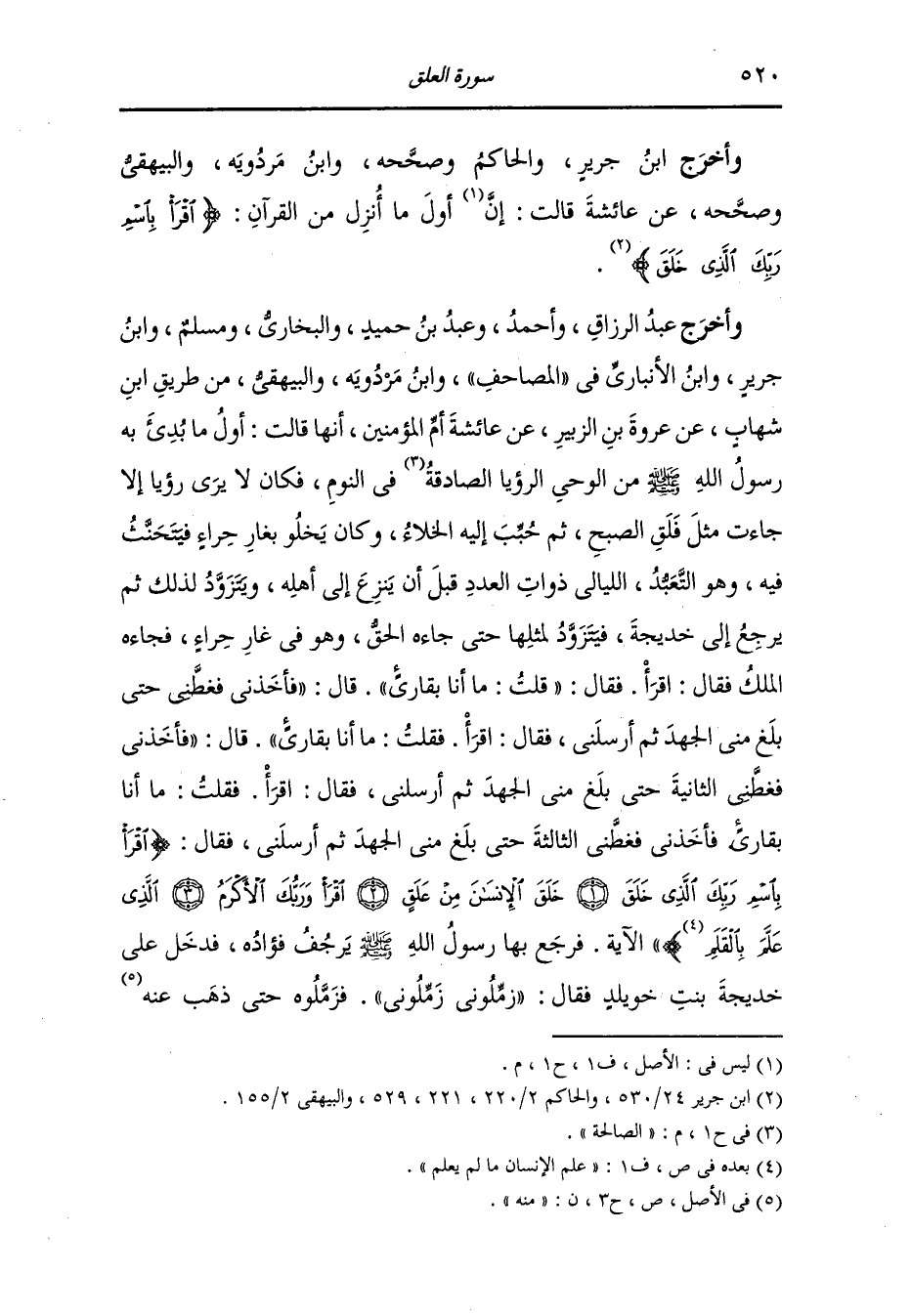 وأخرج عبد الرزاق وأحمد ، وعَبد بن حُمَيد والبخاري ومسلم ، وَابن جَرِير ، وَابن الأنباري في المصاحف ، وَابن مردويه والبيهقي من طريق ابن شهاب عن عروة بن الزبير عن عائشة أم المؤمنين أنها قالت : أول ما بدئ به رسول الله صلى الله عليه وسلم من الوحي الرؤيا الصالحة في النوم فكان لا يرى رؤيا إلا جاءت مثل فلق الصبح ثم حبب إليه الخلاء وكان يخلو بغار حراء فيتحنث فيه وهو التعبد الليالي ذوات العدد قبل أن ينزع إلى أهله ويتزود لذلك ثم يرجع إلى خديجة فيتزود لمثلها حتى جاءه الحق وهو في غار حراء فجاءه الملك فقال {اقرأ} قال : قلت : ما أنا بقارئ ، قال : فأخذني فغطني حتى بلغ مني الجهد ثم أرسلني فقال : اقرأ فقلت : ما أنا بقارئ ، قال : فأخذني فغطني الثانية حتى بلغ مني الجهد ثم أرسلني فقال : اقرأ فقلت : ما أنا بقارئ فأخذني فغطني الثالثة حتى بلغ مني الجهد ثم أرسلني فقال : {اقرأ باسم ربك الذي خلق خلق الإنسان من علق اقرأ وربك الأكرم الذي علم بالقلم} الآية فرجع بها رسول الله صلى الله عليه وسلم يرجف فؤاده فدخل على خديجة بنت خويلد فقال : زملوني زملوني ، فزملوه حتى ذهب عنه