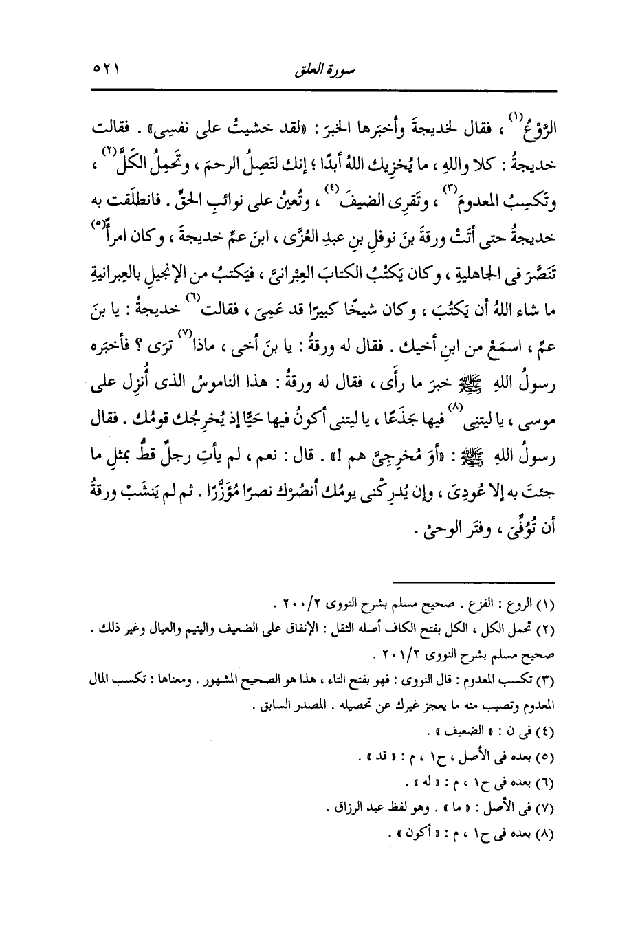 الروع فقال لخديجة وأخبرها الخبر : لقد خشيت على نفسي فقالت خديجة : كلا والله ما يخزيك الله أبدا إنك لتصل الرحم وتحمل الكل وتكسب المعدوم وتقري الضيف وتعين على نوائب الحق ، فانطلقت به خديجة حتى أتت ورقة بن نوفل بن أسد بن عبد العزى - ابن عم خديجة - وكان امرأ قد تنصر في الجاهلية وكان يكتب الكتاب العبراني فيكتب من الإنجيل بالعبرانية ما شاء الله أن يكتب وكان شيخا كبيرا قد عمي فقالت له خديجة : يا ابن عم اسمع من ابن أخيك ، فقال له روقة : يا ابن أخي ماذا ترى فأخبره رسول الله صلى الله عليه وسلم خبر ما رأى فقال له ورقة : هذا الناموس الذي أنزل الله على موسى يا ليتني أكون فيها جذعا يا ليتني أكون فيها حيا إذا يخرجك قومك ، فقال رسول الله صلى الله عليه وسلم : أو مخرجي هم ، قال : نعم لم يأت رجل قط بمثل ما جئت به إلا عودي وإن يدركني يومك أنصرك نصرا مؤزرا ، ثم لم ينشب ورقة أن توفي وفتر الوحي .