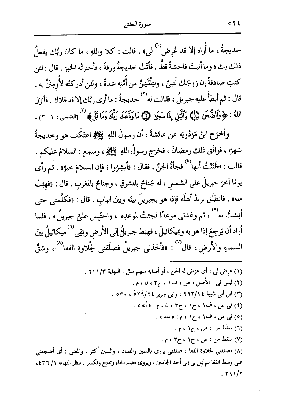 خديجة ما أراه إلا قد عرض لي ، قالت : كلا والله ما كان ربك يفعل ذلك بك وما أتيت فاحشة قط ، فأتت خديجة ورقة فأخبرته الخبر ، قال : لأن كنت صادقتة إن زوجك لنبي وليقين من أمته شدة ولئن أدركته لأمنن به ، قال : ثم أبطأ عليه جبريل فقلت خديجة : ما أرى ربك إلا قد قلاك ، فأنزل الله (والضحى والليل إذا سجى ما ودعك ربك وما قلى) (سورة الضحى آية 1).