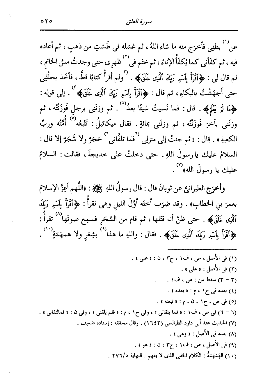 عن بطني فأخرج منه ما شاء الله ثم غسله في طست من ذهب ثم أعاد فيه ثم كفأني كما يكفأ الإناء ثم ختم في ظهري حتى وجدت مس الخاتم ثم قال لي : اقرأ باسم ربك الذي خلق ولم أقرأ كتابا قط فأخذ بحلقي حتى أجهشت بالبكاء ثم قال لي : {اقرأ باسم ربك الذي خلق} إلى قوله : {ما لم يعلم} قال : فما نسيت شيئا بعده ، ثم وزنني جبريل برجل فوازنته ثم وزنني بأخر فوازنته ثم وزنني بمائة ، فقال ميكائيل : تبعته أمته ورب الكعبة ، قال : ثم جئت إلى منزلي فلم يلقني حجر ولا شجر إلا قال : السلام عليك يا رسول الله حتى دخلت على خديجة فقالت : السلام عليك يا رسول الله.