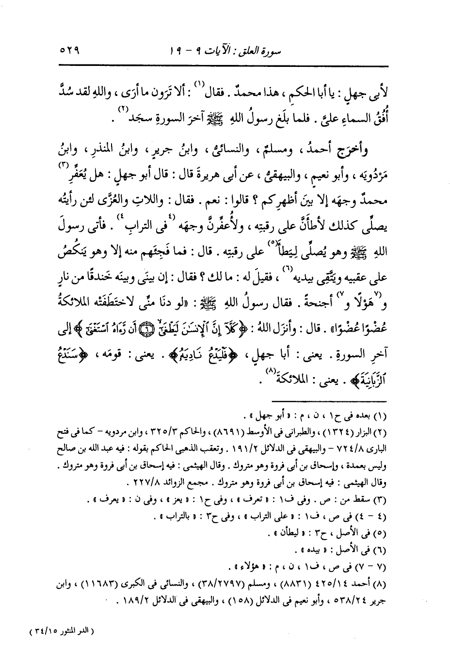 وأخرج أحمد ومسلم والنسائي ، وَابن جَرِير ، وَابن المنذر ، وَابن مردويه وأبو نعيم والبيهقي عن أبي هريرة قال : قال أبو جهل : هل يعفر محمد وجهه إلا بين أظهركم قالوا : نعم ، فقال : واللات والعزى لئن رأيته يصلي كذلك لأطأن على رقبته ولأعفرن وجهه في التراب ، فأتى رسول الله صلى الله عليه وسلم وهو يصلي ليطأ على رقبته ، قال : فما فجئهم منه إلا وهو ينكص على عقبيه يتقي بيديه فقيل له : مالك قال : إن بيني وبينه خندقا من نار وهؤلاء أجنحة فقال رسول الله صلى الله عليه وسلم : لو دنا مني لاختطفته الملائكة عضوا عضوا قال : وأنزل الله {كلا إن الإنسان ليطغى} إلى آخر السورة يعني أبا جهل {فليدع ناديه} يعني قومه {سندع الزبانية} يعني الملائكة.