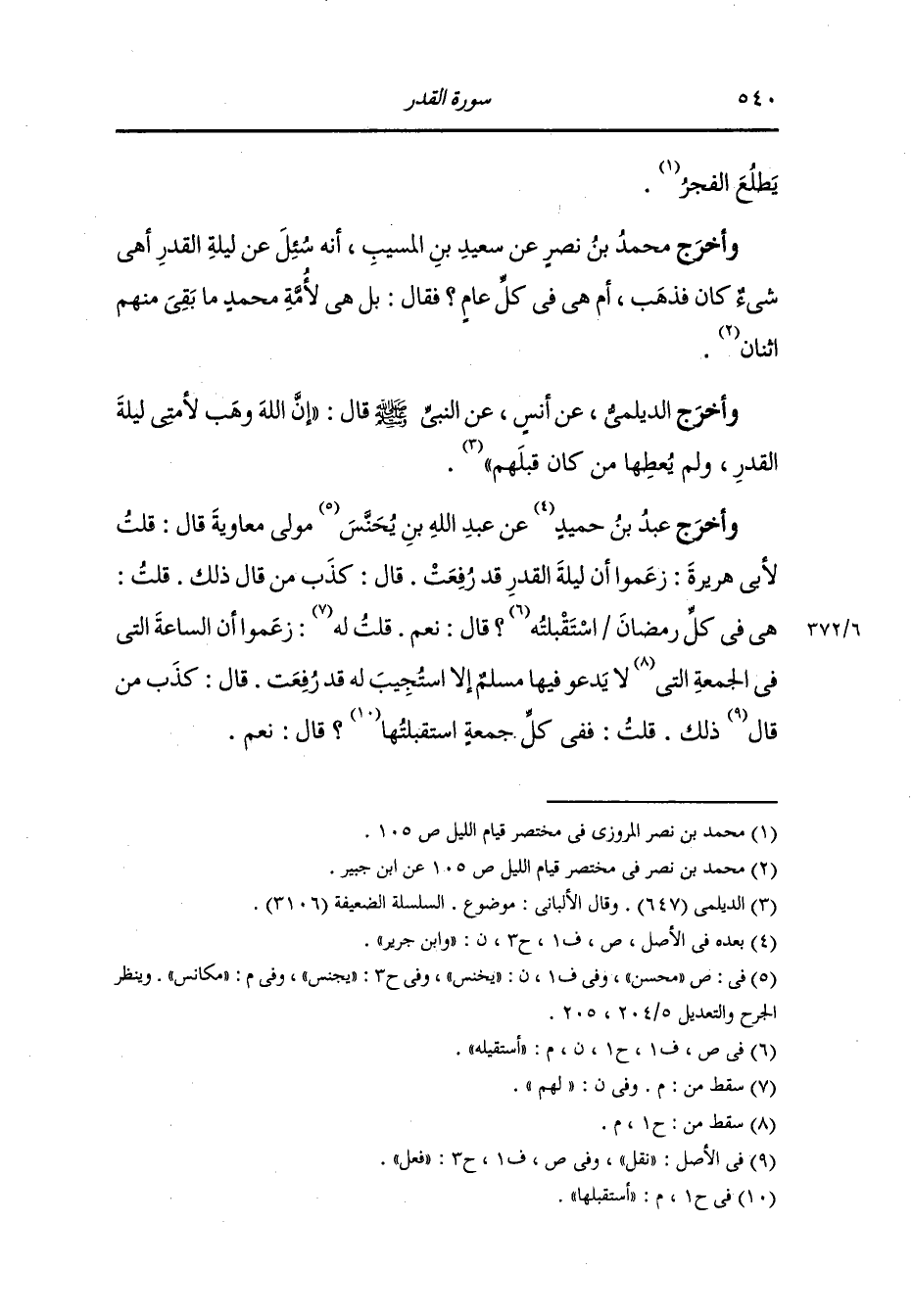 وأخرج محمد بن نصر عن سعيد بن المسيب أنه سئل عن ليلة القدر أهي شيء كان فذهب أم هي في كل عام فقال : بل هي لأمة محمد ما بقي منهم اثنان.