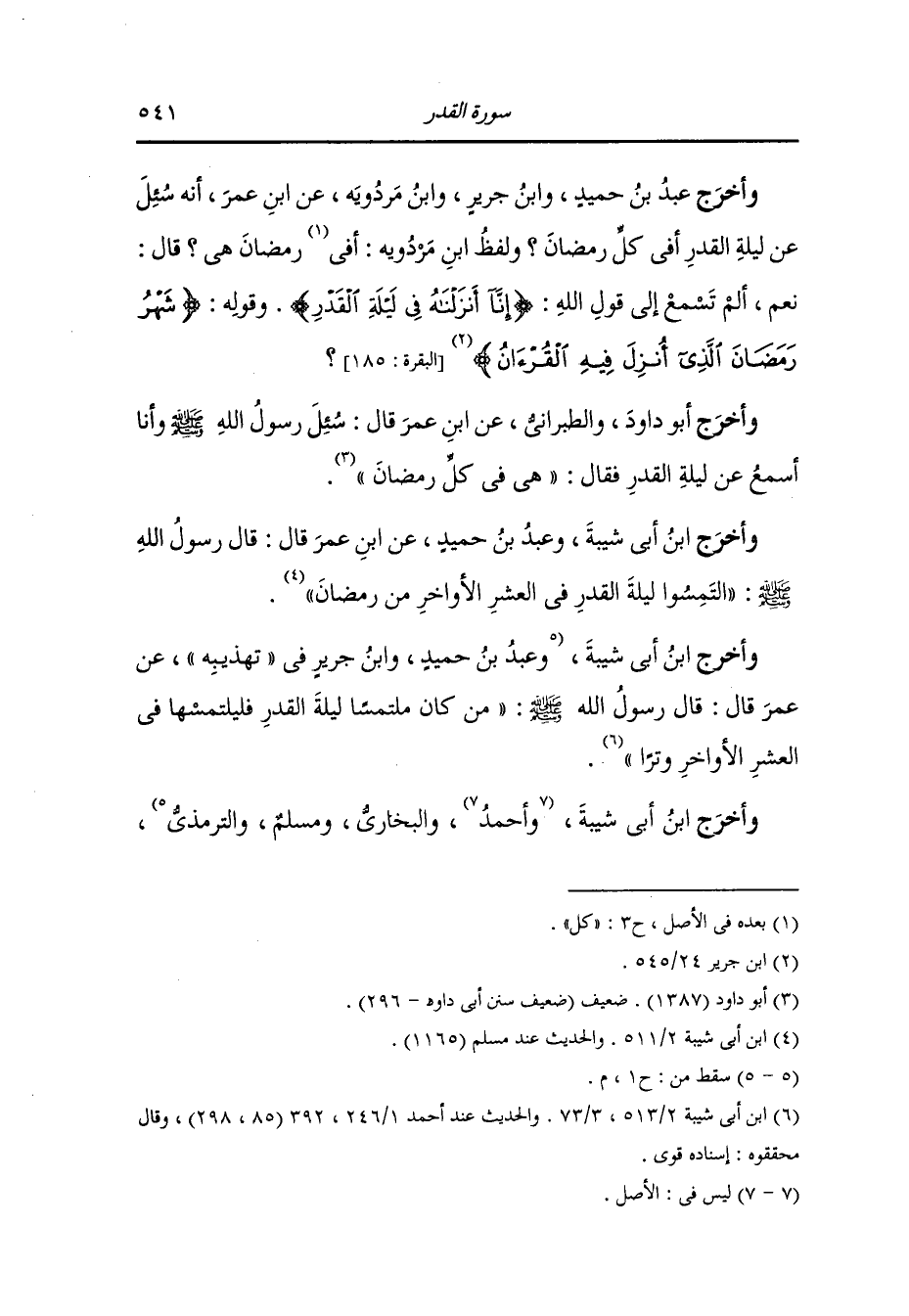 وأخرج عَبد بن حُمَيد ، وَابن جَرِير ، وَابن مردويه عن ابن عمر أنه سئل عن ليلة القدر أفي كل رمضان ولفظ ابن مردويه : أفي رمضان هي قال : نعم ألم تسمع إلى قول الله تعالى : {إنا أنزلناه في ليلة القدر} وقوله : (شهر رمضان الذي أنزل فيه القرآن) (سورة البقرة الآية 185).