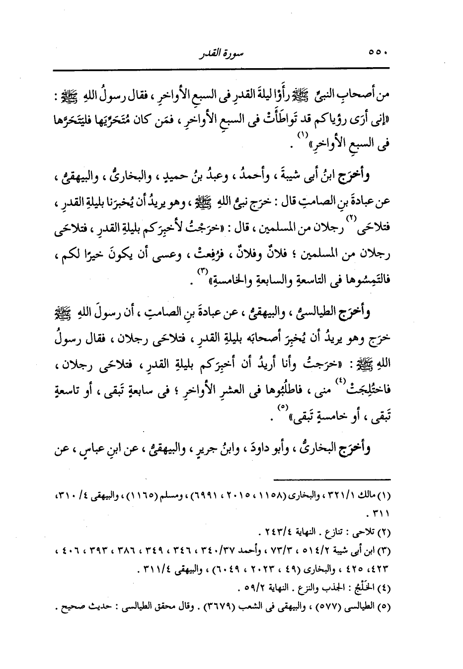 وأخرج ابن أبي شيبة وأحمد ، وعَبد بن حُمَيد والبخاري والبيهقي عن عبادة بن الصامت قال : خرج نبي الله صلى الله عليه وسلم وهو يريد أن يخبرنا بليلة القدر فتلاحى رجلان من المسلمين قال : خرجت لأخبركم بليلة القدر فتلاحى رجلان من المسلمين فلان وفلان فرفعت وعسى أن يكون خيرا لكم فالتمسوها في التاسعة والسابعة والخامسة.