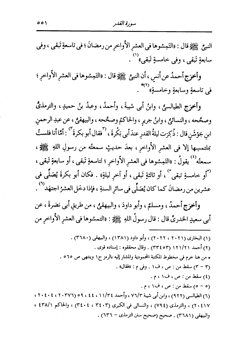 وأخرج الطيالسي ، وَابن أبي شيبة وأحمد ، وعَبد بن حُمَيد والترمذي وصححه والنسائي ، وَابن جَرِير والحاكم وصححه والبيهقي عن عبد الرحمن بن جوشن قال : ذكرت ليلة القدر عند أبي بكرة فقال : أما أنا فلست بملتمسها إلا في العشر الأواخر بعد حديث سمعته من رسول الله صلى الله عليه وسلم يقول : التمسوها في العشر الأواخر لتاسعة تبقى أو سابعة تبقى أو ثالثة تبقى أو آخر ليلة فكان أبو بكرة رضي الله عنه يصلي في عشرين من رمضان كما كان يصلي في سائر السنة فإذا دخل العشر اجتهد.