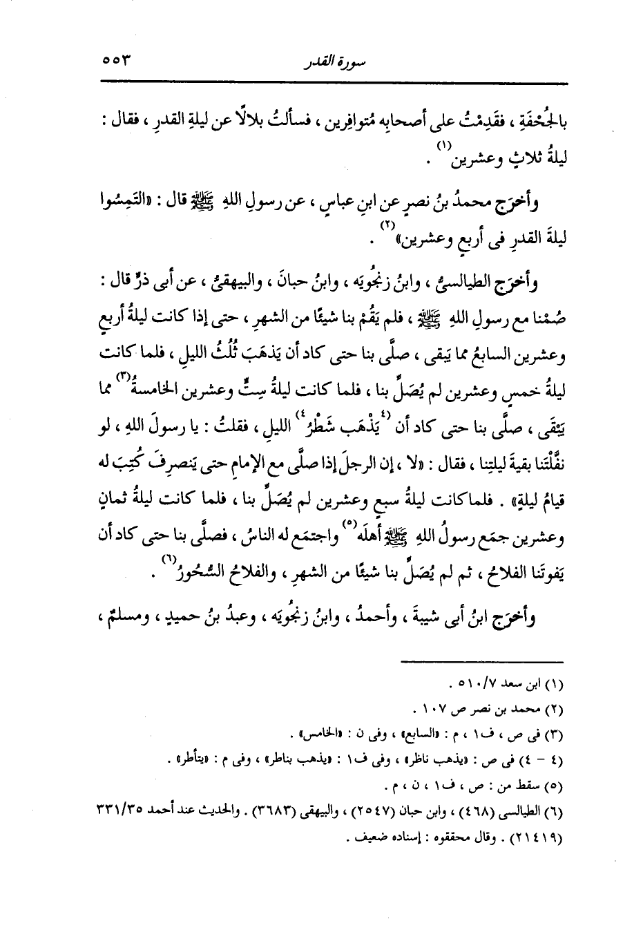 وأخرج الطيالسي ، وَابن زنجويه ، وَابن حبان والبيهقي عن أبي ذر رضي الله عنه قال : صمنا مع رسول الله صلى الله عليه وسلم فلم يقم بنا شيئا من الشهر حتى إذا كانت ليلة أربع وعشرين السابع مما يبقى صلى بنا حتى كاد أن يذهب ثلث الليل فلما كانت ليلة خمس وعشرين لم يصل بنا فلما كانت ليلة ست وعشرين السابع مما بقي صلى بنا حتى كاد أن يتأطر الليل فقلت يا رسول الله : لو نفلتنا بقية ليلتنا فقال : لا إن الرجل إذا صلى مع الإمام حتى ينصرف كتب له قيام ليلة فلماكانت ليلة سبع وعشرين لم يصل بنا فلما كانت ليلة ثمان وعشرين جمع رسول الله صلى الله عليه وسلم واجتمع له الناس فصلى بنا حتى كاد أن يفوتنا الفلاح ثم لم يصل بنا شيئا من الشهر والفلاح السحور.