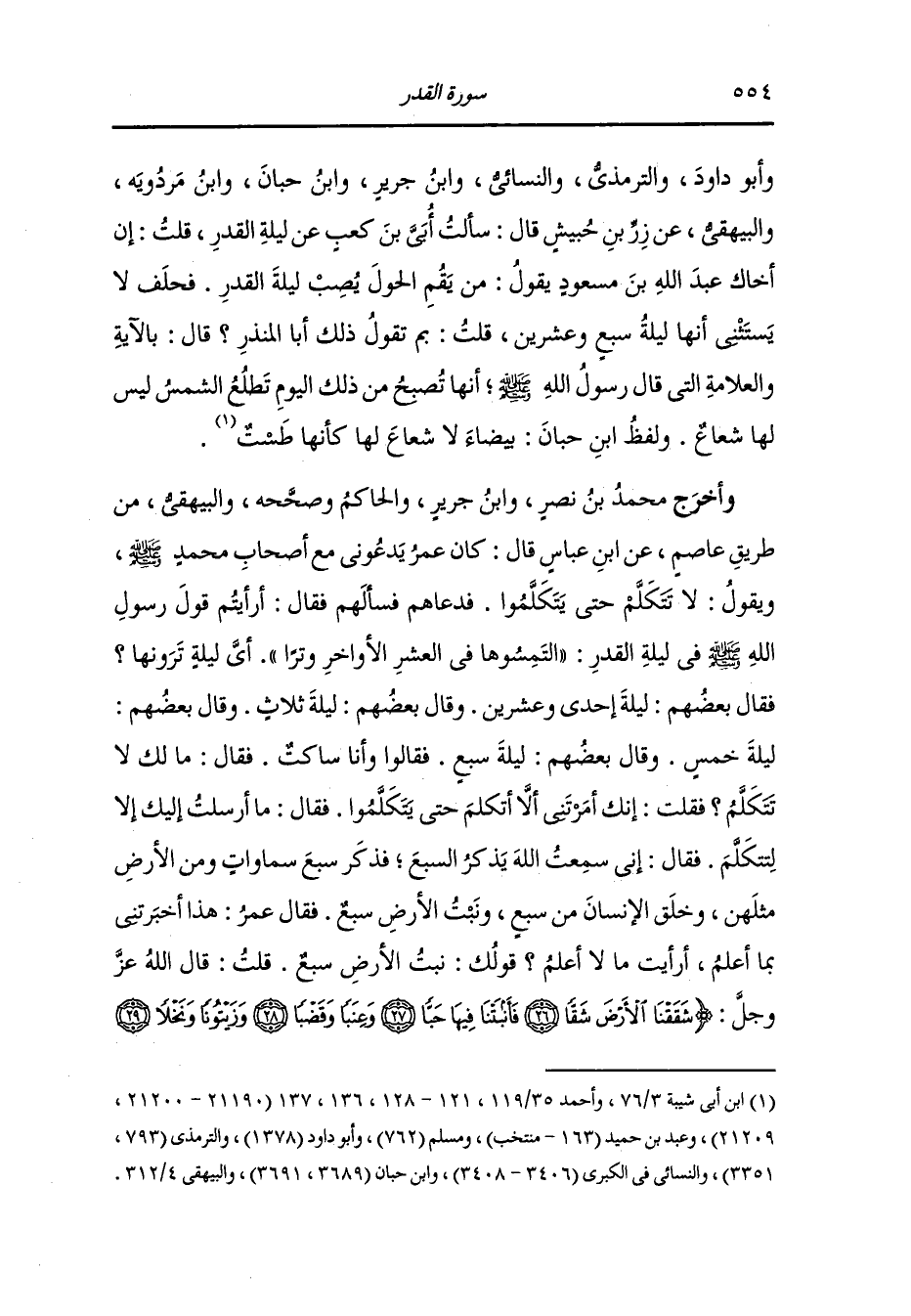 وأخرج محمد بن نصر ، وَابن جَرِير والحاكم وصححه والبيهقي من طريق عاصم عن ابن عباس رضي الله عنهما قال : كان عمر رضي الله عنه يدعوني مع أصحاب محمد صلى الله عليه وسلم ويقول : لا تتكلم حتى يتكلموا فدعاهم فسألهم فقال : أرأيتم قول رسول الله صلى الله عليه وسلم في ليلة القدر : التمسوها في العشر الأواخر وترا أي ليلة ترونها فقال بعضهم : ليلة إحدى وعشرين وقال بعضهم : ليلة ثلاث وقال بعضهم : ليلة خمس وقال بعضهم : ليلة سبع ، فقالوا : وأنا ساكت ، فقال : مالك لا تتكلم فقلت : إنك أمرتني أن لا أتكلم حتى يتكلموا ، فقال : ما أرسلت إليك إلا لتكلم فقال : إني سمعت الله يذكر السبع فذكر سبع سموات ومن الأرض مثلهن وخلق الإنسان من سبع ونبت الأرض سبع ، فقال عمر رضي الله عنه : هذا أخبرتني بما أعلم أرأيت ما لا أعلم فذلك نبت الأرض سبع ، قلت : قال الله عز وجل (شققنا الأرض فأنبتنا فيها حبا وعنبا وقضبا وزيتونا ونخلا