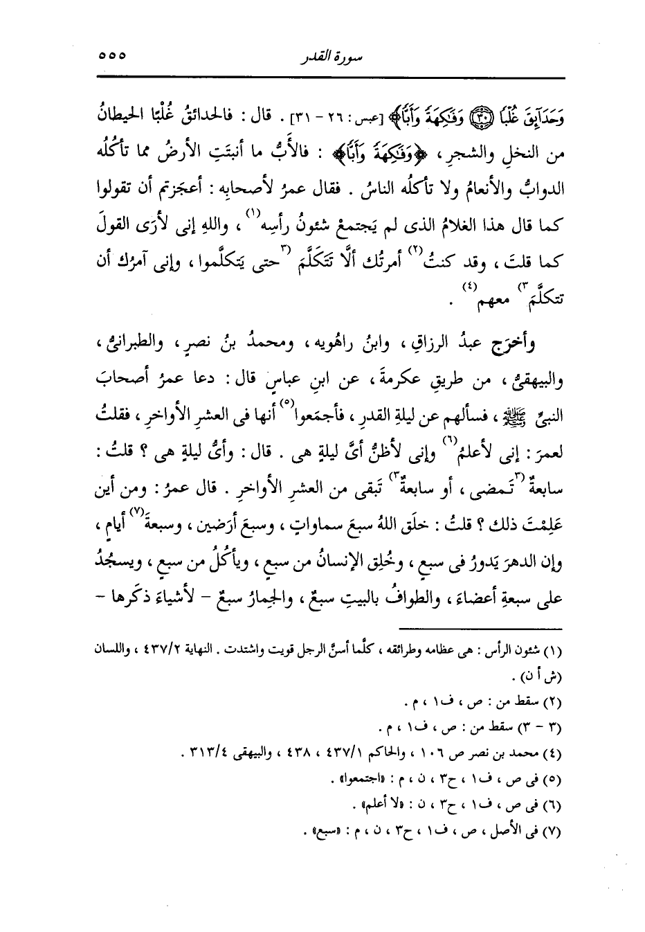 وحدائق غلبا وفاكهة وأبا) (سورة عبس الآية 26) قال : فالحدائق غلبا الحيطان من النخل والشجر (وفاكهة وأبا) فالأب ما أنبتت الأرض مما تأكله الدواب والأنعام ولا تأكله الناس ، فقال عمر رضي الله عنه لأصحابه : أعجزتم أن تقولوا كما قال هذا الغلام الذي لم يجتمع شؤون رأسه والله إني لأرى القول كما قلت وقد أمرتك أن لا تتكلم معهم.