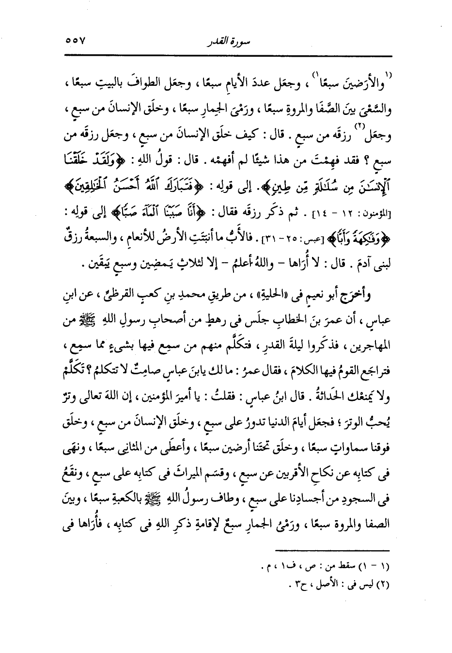 وأخرج أبو نعيم في الحلية من طريق محمد بن كعب القرظي رضي الله عنه عن ابن عباس رضي الله عنهما أن عمر بن الخطاب رضي الله عنه جلس في رهط من أصحاب رسول الله صلى الله عليه وسلم من المهاجرين فذكروا ليلة القدر فتكلم منهم من سمع فيها بشيء مما سمع فتراجع القوم فيها الكلام فقال عمر رضي الله عنه مالك يا ابن عباس صامت لا تتكلم تكلم ولا يمنعك الحداثة ، قال ابن عباس رضي الله عنهما : فقلت يا أمير المؤمنين : إن الله تعالى وتر يحب الوتر فجعل أيام الدنيا تدور على سبع وخلق الإنسان من سبع وجعل فوقنا سموات سبعا وخلق تحتنا أرضين سبعا وأعطى من المثاني سبعا ونهى في كتابه عن نكاح الأقربين عن سبع وقسم الميراث في كتابه على سبع ونقع في السجود من أجسادنا على سبع وطاف رسول الله صلى الله عليه وسلم بالكعبة سبعا وبين الصفا والمروة سبعا ورمى الجمار سبع لإقامة ذكر الله في كتابه فأراها في