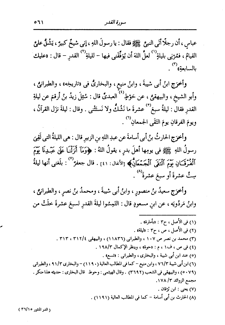 وأخرج ابن أبي شيبة ، وَابن منيع والبخاري في تاريخه والطبراني وأبو الشيخ والبيهقي عن حوة العبدي قال : سئل زيد بن أرقم رضي الله عنه عن ليلة القدر فقال : ليلة سبع عشرة ما تشك ولا تستثن وقال : ليلة نزل القرآن ويوم الفرقان يوم التقى الجمعان.