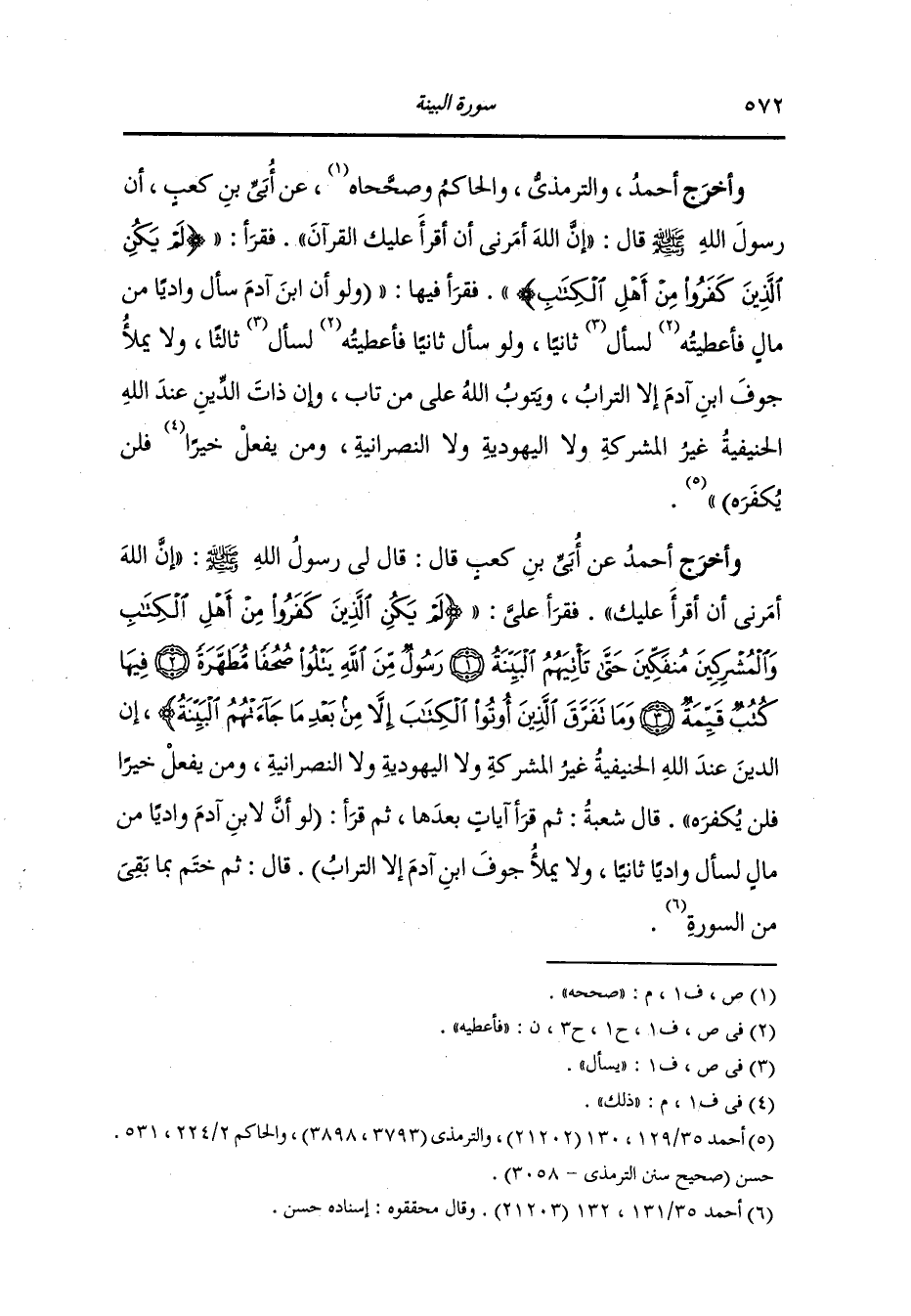 وأخرج أحمد عن أبي بن كعب قال : قال لي رسول الله صلى الله عليه وسلم : إن الله أمرني أن أقرأ عليك فقرأ علي {لم يكن الذين كفروا من أهل الكتاب والمشركين منفكين حتى تأتيهم البينة رسول من الله يتلو صحفا مطهرة فيها كتب قيمة وما تفرق الذين أوتوا الكتاب إلا من بعد ما جاءتهم البينة} إن الدين عند الله الحنيفية غير المشركة ولا اليهودية ولا النصرانية ومن يفعل خيرا فلن يكفره ، قال شعبة : ثم قرأ آيات بعدها ثم قرأ لو أن لابن آدم واديا من مال لسأل واديا ثانيا ولا يملأ جوف ابن آدم إلا التراب قال : ثم ختم بما بقي من السورة.