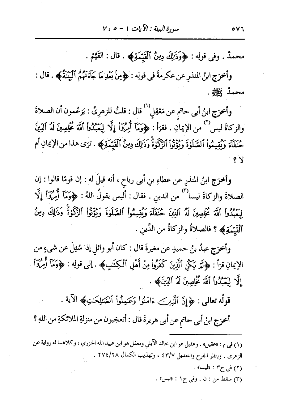 وأخرج ابن أبي حاتم عن عقيل قال : قلت للزهري تزعمون أن الصلاة والزكاة ليس من الإيمان فقرأ {وما أمروا إلا ليعبدوا الله مخلصين له الدين حنفاء ويقيموا الصلاة ويؤتوا الزكاة وذلك دين القيمة} ترى هذا من الإيمان أم لا.