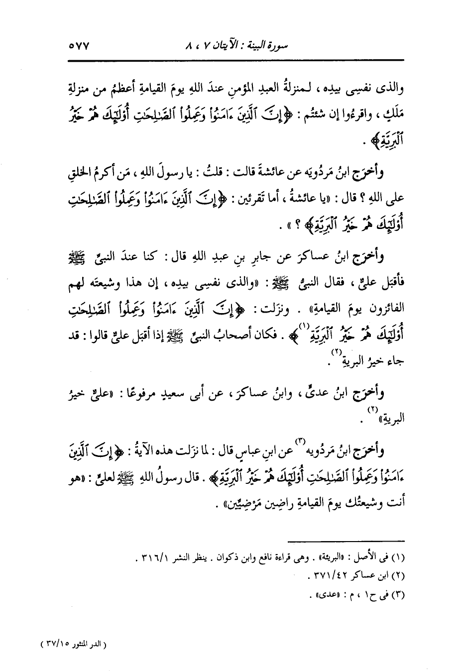 وأخرج ابن عدي عن ابن عباس قال : لما نزلت {إن الذين آمنوا وعملوا الصالحات أولئك هم خير البرية} قال رسول الله صلى الله عليه وسلم لعلي : هو أنت وشيعتك يوم القيامة راضين مرضيين.