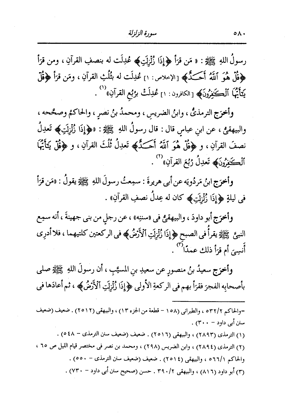 وأخرج الترمذي ، وَابن الضريس ومحمد بن نصر الحاكم وصححه والبيهقي عن ابن عباس قال : قال رسول الله صلى الله عليه وسلم : {إذا زلزلت} تعدل نصف القرآن و(قل هو الله أحد) تعدل ثلث القرآن و(قل يا أيها الكافرون) تعدل ربع القرآن.