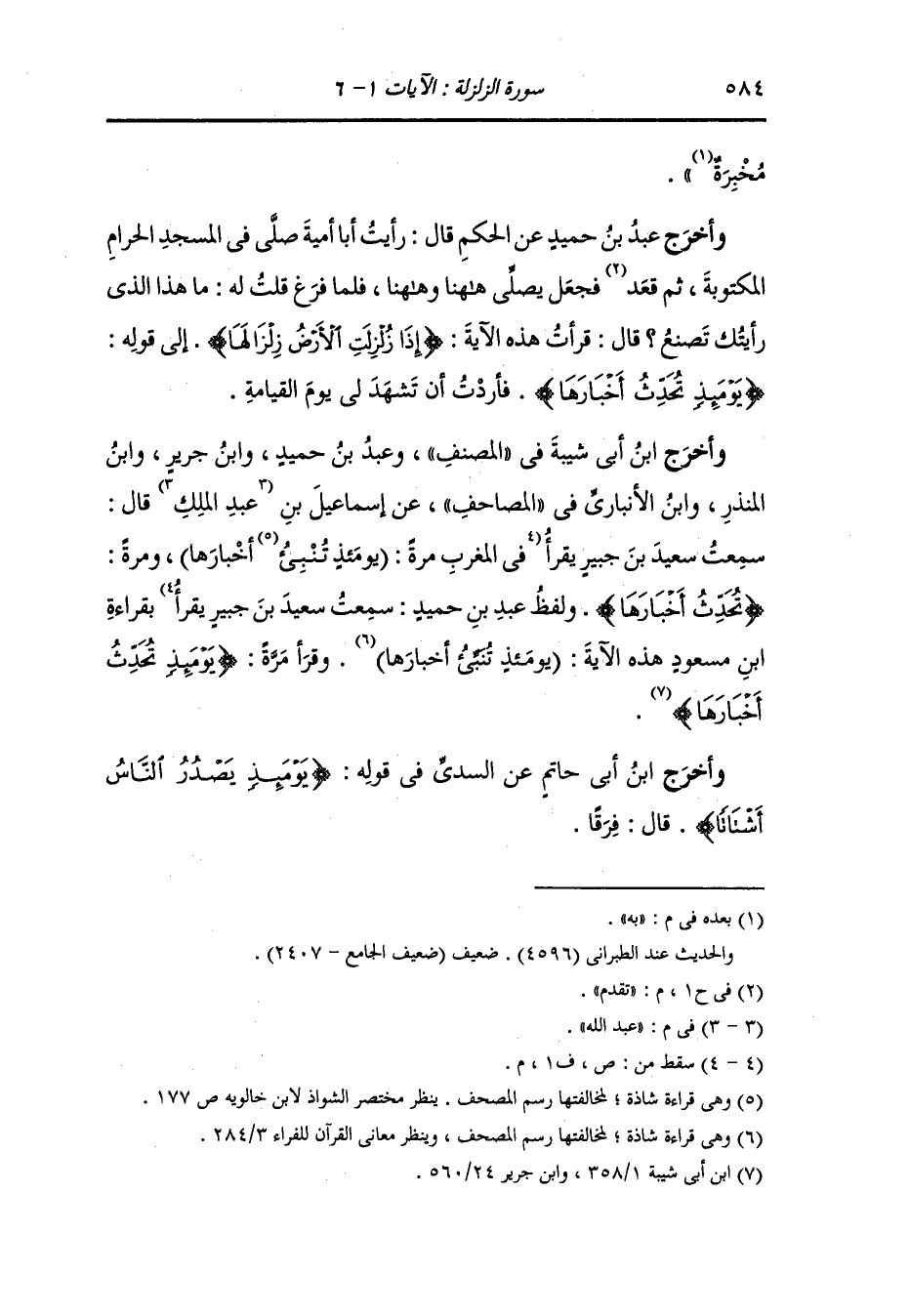 وأخرج ابن أبي شيبة في المصنف ، وعَبد بن حُمَيد ، وَابن جَرِير ، وَابن المنذر ، وَابن الأنباري في المصاحف عن إسماعيل بن عبد الله قال : سمعت سعيد بن جبير يقرأ بقراءة ابن مسعود هذه الآية : يومئذ تنبئ أخبارها وقرأ مرة {يومئذ تحدث أخبارها}.