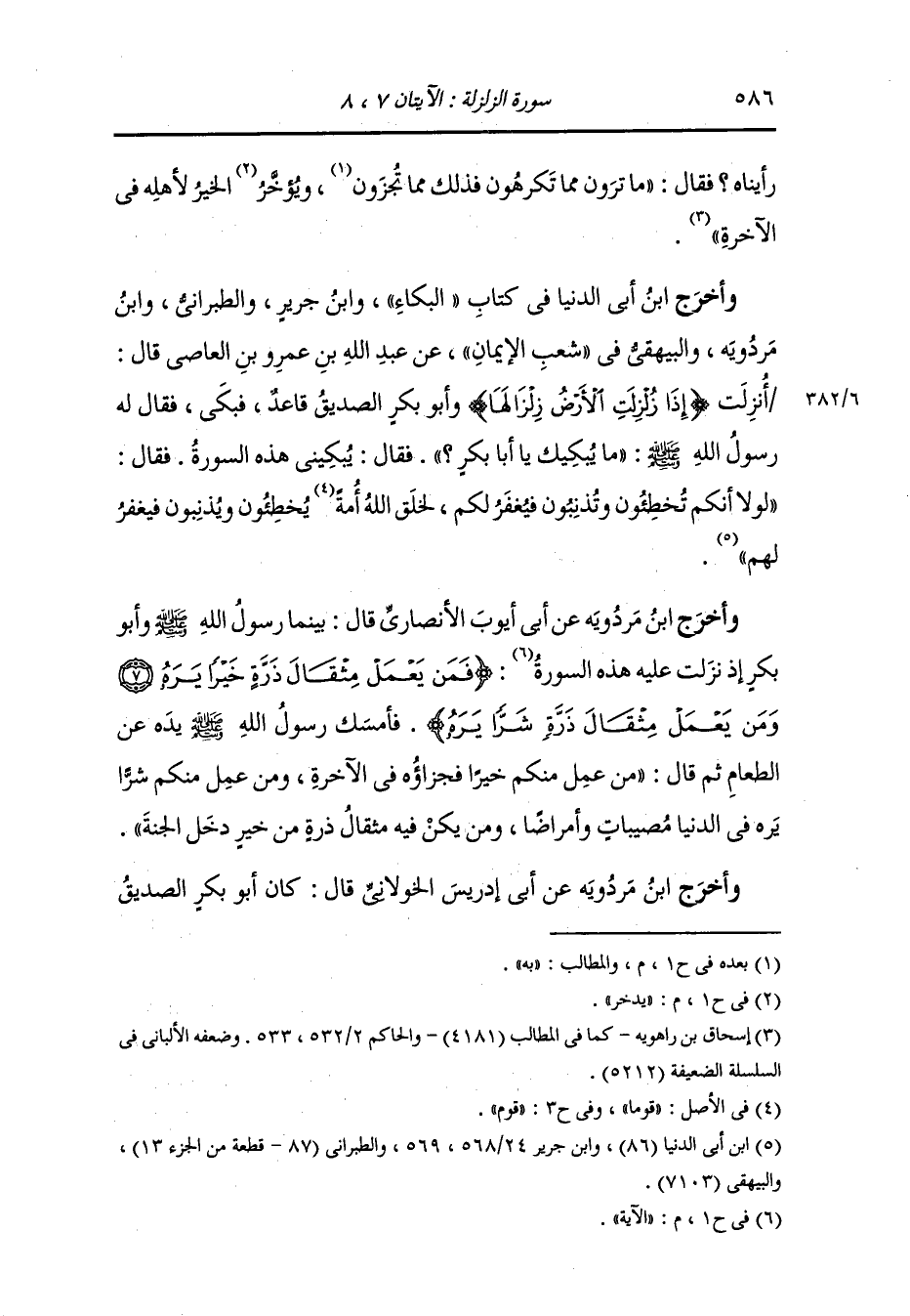 وأخرج ابن أبي الدنيا في كتاب البكاء ، وَابن جَرِير والطبراني ، وَابن مردويه والبيهقي في شعب الإيمان عن عبد الله بن عمرو بن العاص رضي الله عنه قال : أنزلت {إذا زلزلت الأرض زلزالها} وأبو بكر الصديق رضي الله عنه قاعد فبكى فقال له رسول الله صلى الله عليه وسلم : ما يبكيك يا أبا بكر قال : تبكيني هذه السورة ، فقال : لولا أنكم تخطئون وتذنبون فيغفر لكم لخلق الله أمة يخطئون ويذنبون فيغفر لهم.