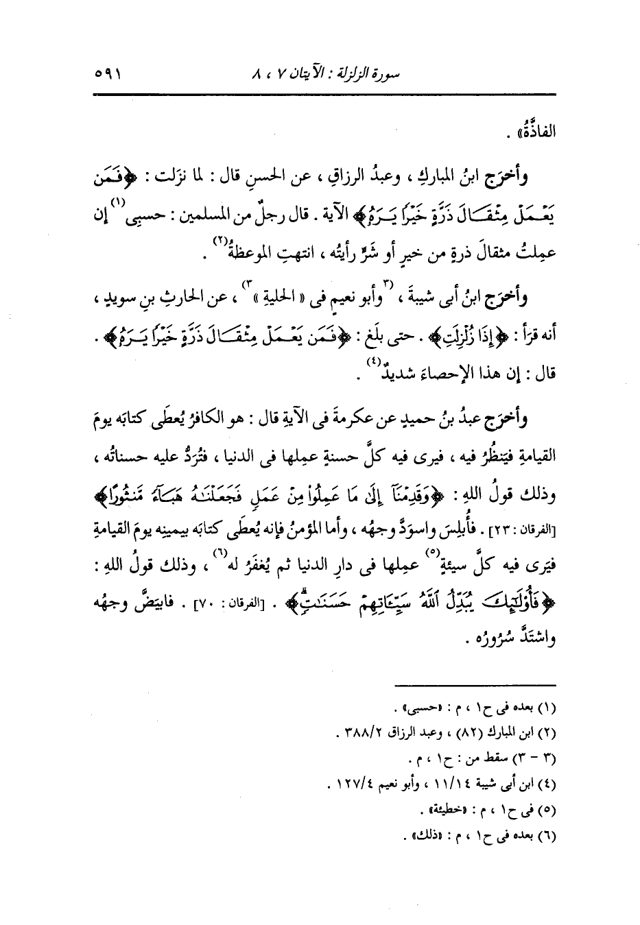 وأخرج أحمد في الزهد ، وَابن المنذر عن أبي الدرداء رضي الله عنه قال : لولا ثلاث لأحببت أن لا أبقى في الدنيا وضعي وجهي للسجود لخالقي في اختلاف الليل والنهار أقدمه لحياتي وظمأ الهواجر ومقاعدة أقوام ينتقون الكلام كما تنتقى الفاكهة وتمام التقوى أن يتقي الله تعالى البعد حتى يتقيه في مثقال ذرة حتى أن يترك بعض ما يرى أنه حلال خشية أن يكون حراما حتى يكون حاجزا بينه وبين الحرام إن الله قد بين للناس الذي هو يصيرهم إليه قال : {فمن يعمل مثقال ذرة خيرا يره ومن يعمل مثقال ذرة شرا يره} فلا تحقرن شيئا من الشر أن تتقيه ولا شيئا من الشر أن تفعله.