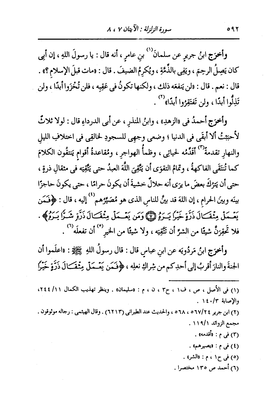 وأخرج مالك ، وَابن سعد ، وعَبد بن حُمَيد من طريق عائشة رضي الله عنها أن سائلا أتاها وعندها سلة من عنب فأخذت حبة من عنب فأعطته فقيل لها في ذلك فقالت : هذه أثقل من ذر كثير ثم قرأت {فمن يعمل مثقال ذرة خيرا يره}.