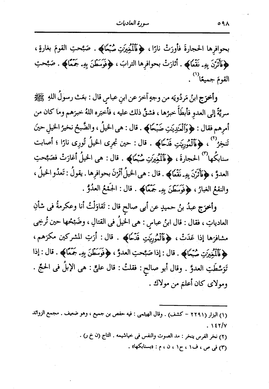 وأخرج ابن جرير ، وَابن أبي حاتم ، وَابن الأنباري في المصاحف والحاكم وصححه ، وَابن مردويه عن ابن عباس قال : بينما أنا في الحجر جالس إذا أتاني رجل فسأل عن العاديات ضبحا فقلت : الخيل حين تغير في سبيل الله ثم تأوي إلى الليل فيصصنعون طعامهم ويورون نارهم فانفتل عني فذهب عني إلى علي بن أبي طالب وهو جالس تحت سقاية زمزم فسأله عن العاديات ضبحا ، فقال : سألت عنها أحدا قبل قال نعم ، سألت عنها ابن عباس ، فقال : هي الخيل حين تغير في سبيل الله ، فقال : اذهب فادعه لي ، فلا وقفت على رأسه قال : تفتي الناس بما لا علم لك والله إن أول غزوة في الإسلام لبدر وما كان معنا إلا فرسان للزبير وفرس للمقداد بن الأسود فكيف يكون العاديات ضبحا إنما العاديات ضبحا من عرفة إلى المزدلفة فإذا أدوا إلى المزدلفة أوروا إلى النيران {فالمغيرات صبحا} من المزدلفة