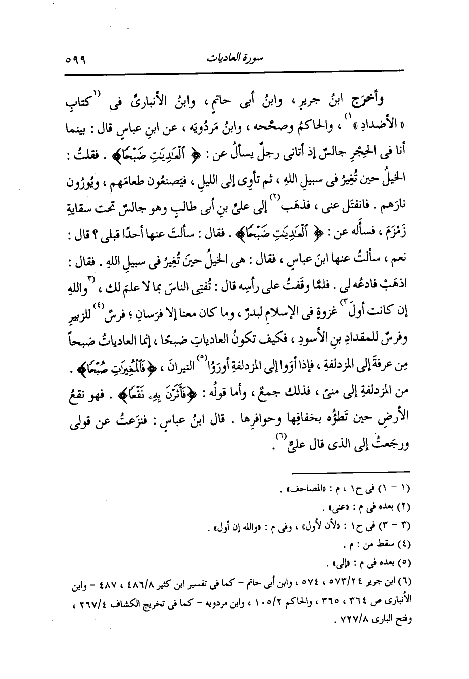 وأخرج ابن جرير ، وَابن المنذر ، وَابن أبي حاتم من طريق الأعمش عن إبراهيم عن عبد الله {والعاديات ضبحا} قال : الإبل قال إبراهيم : وقال علي بن أبي طالب : هي الإبل ، وقال ابن عباس : هي الخيل فبلغ عليا قول ابن عباس فقال : ما كانت لنا خيل يوم بدر قال ابن عباس : إنما كان ذلك في سرية بعثت.