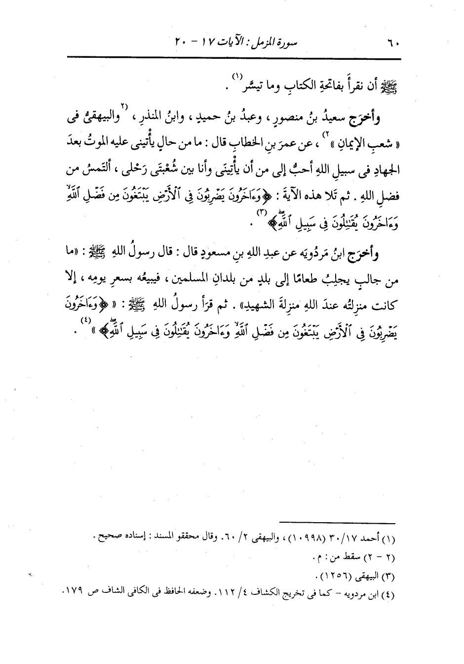 وأخرج سعيد بن منصور ، وعَبد بن حُمَيد ، وَابن المنذر عن عمر بن الخطاب قال : ما من حال يأتيني عليه الموت بعد الجهاد في سبيل الله أحب إلي من أن يأتيني وأنا بين شعبتين رحلي ألتمس من فضل الله ثم تلا هذه الآية {وآخرون يضربون في الأرض يبتغون من فضل الله وآخرون يقاتلون في سبيل الله}.