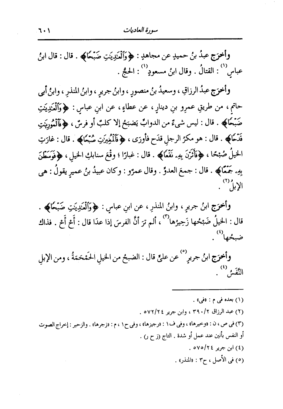 وأخرج الفريابي ، وعَبد بن حُمَيد عن مجاهد {والعاديات ضبحا} قال : الخيل ألم تر إلى الفرس إذا أجري كيف يضبح وما ضبح بعير قط {فالموريات قدحا} قال : المكر تقول العرب إذا أراد الرجل أن يمكر بصاحبه : أما والله لأقدحن لك ثم لأورين {فالمغيرات صبحا} قال : الخيل {فأثرن به نقعا} قال : التراب مع