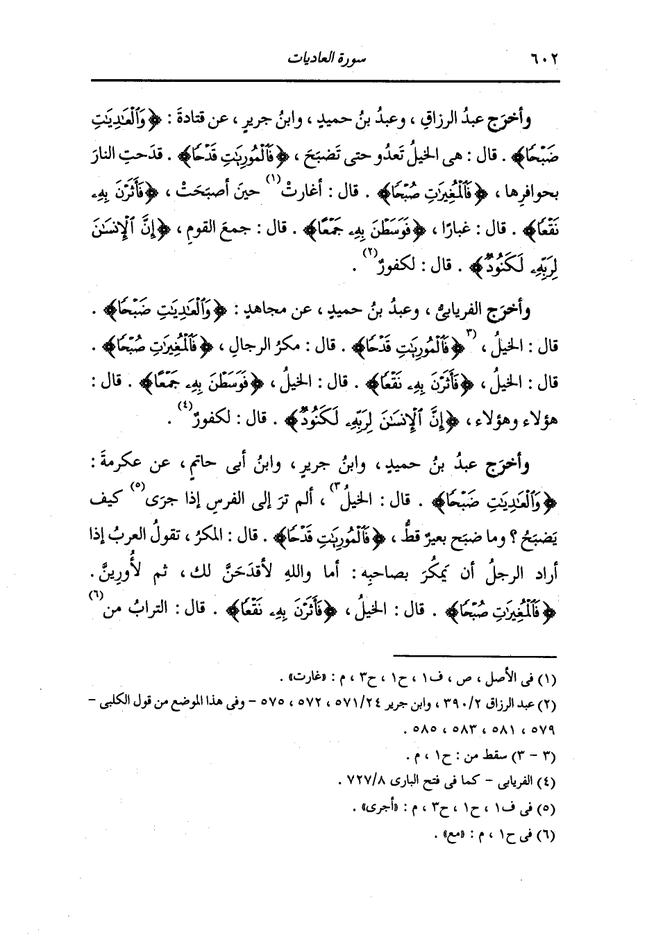 وأخرج عَبد بن حُمَيد عن عطية {والعاديات ضبحا} قال : الخيل ألم ترها إذا عدت تزحر يقول تنحر {فالموريات قدحا} قال : الكر {فالمغيرات صبحا} قال : الخيل {فأثرن به نقعا} قال : الغبار {فوسطن به جمعا} قال : جمع المشركين {إن الإنسان لربه لكنود} قال : لكفور.