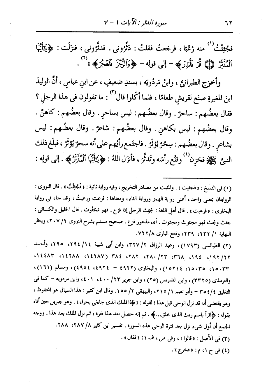 وأخرج الطبراني ، وَابن مردويه بسند ضعيف عن ابن عباس أن الوليد بن المغيرة صنع لقريش طعاما فلما أكلوا قال : ما تقولون في هذا الرجل فقال بعضهم : ساحر وقال بعضهم : ليس بساحر وقال بعضهم : كاهن وقال بعضهم : ليس بكاهن وقال بعضهم : شاعر وقال بعضهم ليس بشاعر وقال بعضهم : سحر يؤثر فاجتمع رأيهم على أنه سحر يؤثر فبلغ ذلك النَّبِيّ صلى الله عليه وسلم فخرج وقنع رأسه وتدثر فأنزل الله {يا أيها المدثر} إلى قوله : !