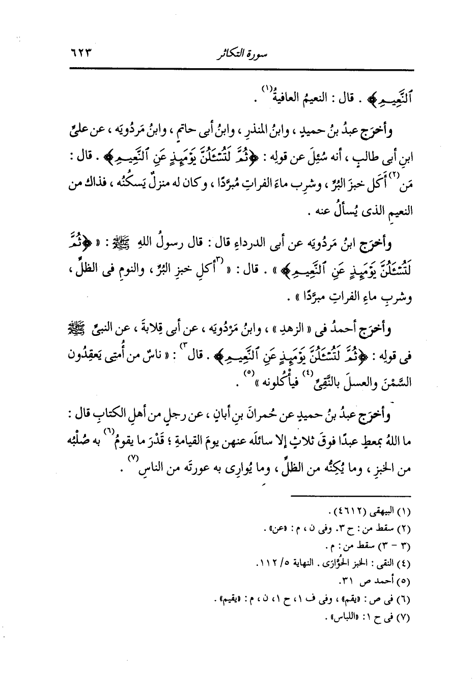 وأخرج ابن أبي شيبة وهناد وأحمد ، وَابن جَرِير ، وَابن مردويه والبيهقي في شعب الإيمان عن محمود بن لبيد قال : لما أنزلت {ألهاكم التكاثر} فقرأ حتى بلغ ثم {لتسألن يومئذ عن النعيم} قالوا يا رسول الله : عن أي نعيم نسأل وإنما هما الأسودان الماء والتمر وسيوفنا على رقابنا والعدو حاضر فعن أي نعيم نسأل قال : أما إن ذلك سيكون.