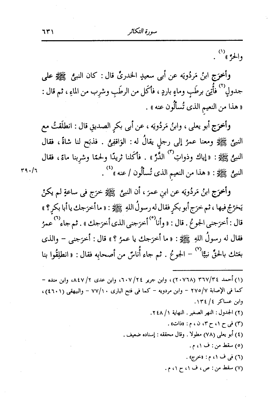 إلى منزل أبي الهيثم فقالت لهم امرأته : إنه ذهب يستعذب لنا فدوروا إلى الحائط ففتحت لهم باب البستان فدخلوا فجلسوا فجاء أبو الهيثم فقالت له امرأته : أتدري من عندك قال : لا قالت له : عندك رسول الله صلى الله عليه وسلم وأصحابه فدخل عليهم فعلق قربته على نخلة ثم أخذ مخرفان فأتى عذقا له فاخترف لهم رطبا فأتاهم به فصبه بين أيديهم فأكلوا منه وبرد لهم ذلك الماء فشربوا منه فقال لهم رسول الله صلى الله عليه وسلم : هذا من النعيم الذي تسألون عنه.