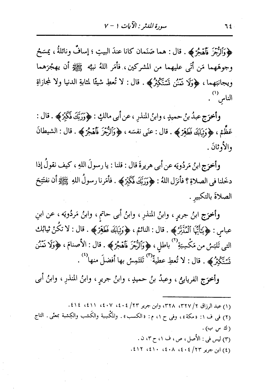 وأخرج ابن جرير ، وَابن المنذر ، وَابن أبي حاتم ، وَابن مردويه عن ابن عباس رضي الله عنهما {يا أيها المدثر} قال : النائم {وثيابك فطهر} قال : لا تكن ثيابك التي تلبس من مكسب باطل {والرجز فاهجر} قال : الأصنام {ولا تمنن تستكثر} قال : لا تعط عطية تلتمس بها أفضل منها.