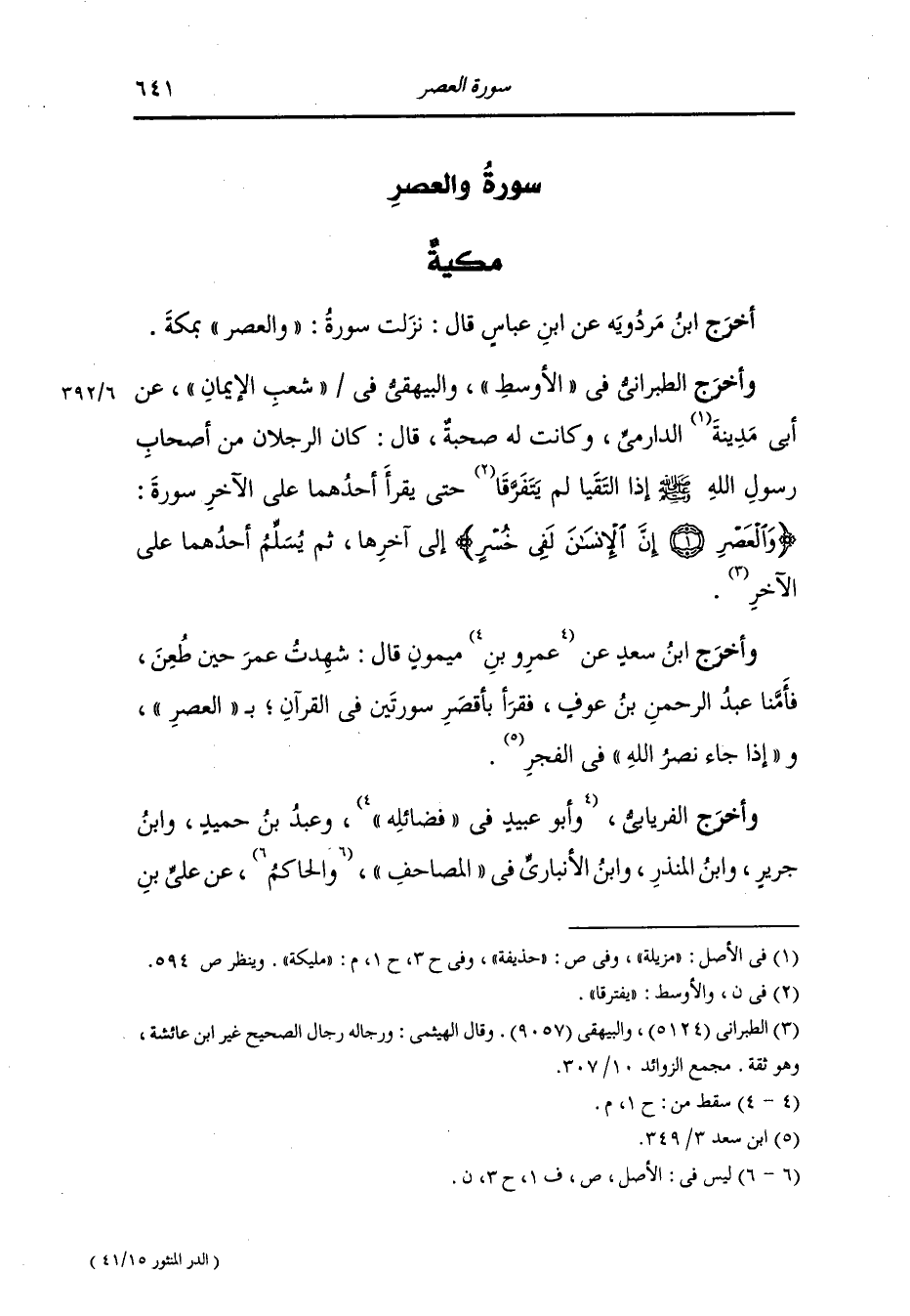 وأخرج عَبد بن حُمَيد عن إبراهيم قال : قرأنا : والعصر إن الإنسان لفي خسر وإنه لفيه إلى آخر الدهر إلا الذين آمنوا وعملوا الصالحات وتواصوا بالحق وتواصوا بالصبر ، ذكر أنها في